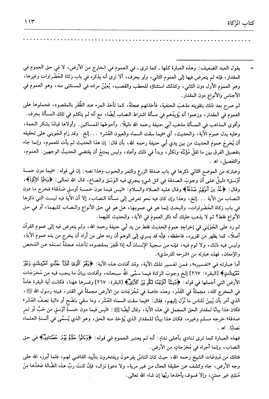 = يقول العبد الضعيف: وهذه العبارة كلها -كما ترى- في العموم في الخارج من الأرض، لا في حق العموم في المقدار، فإنه لم يتعرض فيها إلى العموم الثاني، ولو بحرف، ألا ترى أنه يذكره في باب زكاة الخَضراوات وغيرها، وهو العموم الأول دون الثاني، وكذلك استثناؤه للحطب والقصب، يُعيِّنُ مراده في المستثنى منه، وهو العموم في الأجناس والأنواع دون المقدار.