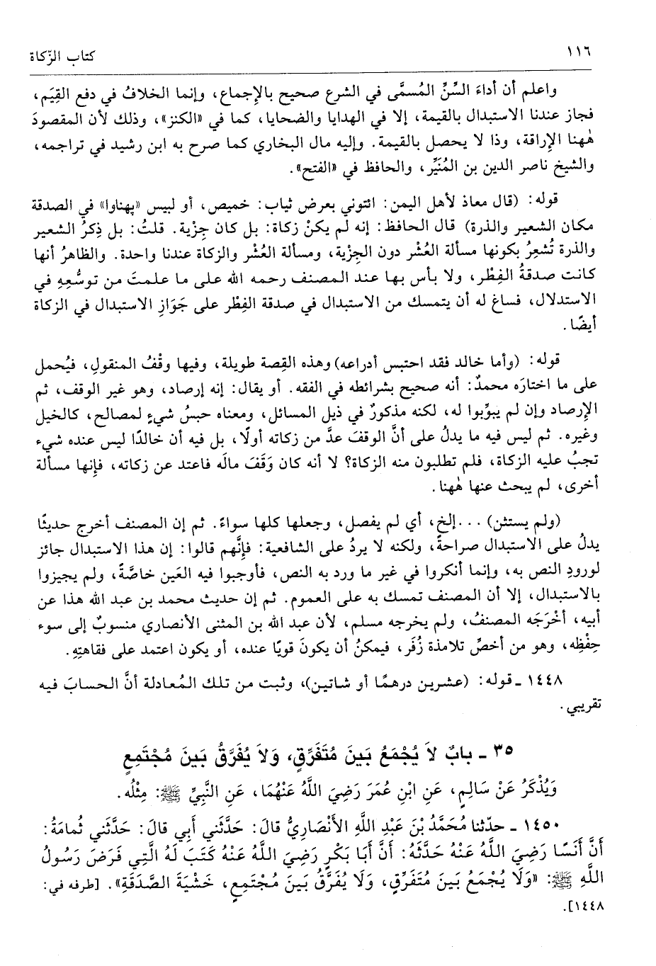 1450 - حَدَّثَنَا مُحَمَّدُ بْنُ عَبْدِ اللَّهِ الأَنْصَارِىُّ قَالَ حَدَّثَنِى أَبِى قَالَ حَدَّثَنِى ثُمَامَةُ أَنَّ أَنَسًا - رضى الله عنه - حَدَّثَهُ أَنَّ أَبَا بَكْرٍ - رضى الله عنه - كَتَبَ لَهُ الَّتِى فَرَضَ رَسُولُ اللَّهِ - صلى الله عليه وسلم - «وَلاَ يُجْمَعُ بَيْنَ مُتَفَرِّقٍ، وَلاَ يُفَرَّقُ بَيْنَ مُجْتَمِعٍ، خَشْيَةَ الصَّدَقَةِ». أطرافه 1448، 1451، 1453، 1454، 1455، 2487، 3106، 5878، 6955 تحفة 6582 - 145/ 2