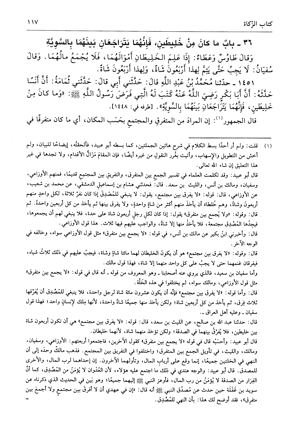 قال أبو عبيد: وقد تكلمت العلماء في تفسير الجمعِ بين المتفرق، والتفريقِ بين المجتمِعِ قديمًا، فمنهم الأوزاعي، وسفيان، ومالك بن أنس، والليث بن سعد. قال: فحدثني هشام بن إسماعيلِ الدمشقي، عن محمد بن شعيب، عن الأوزاعي، قال: قوله: "لا يفرق بين مجتمع، يقول: لا ينبغي للمُصّدِقَ إذا كان نفرٌ ثلاثة، لكل واحدٍ منهم أربعونَ وشاةً، وهم خُلطاءَ أن يأخذَ منهم أكثر من شاةٍ واحدةٍ، ولا يفرق بينها ثم يأخذ من كل أربعين واحدةً. ثم قال: وقوله: "ولا يُجمع بين متفرق" يقول: إذا كان لكلِ رجلٍ أربعون شاة على حدة، فلا ينبغي لهم أن يجمعوها، فيجِدُها المُصَّدِق مجتمعة، فلا يأخذُ منها إلا شاةً، والواجب عليهم فيها ثلاث. هذا قول الأوزاعي.