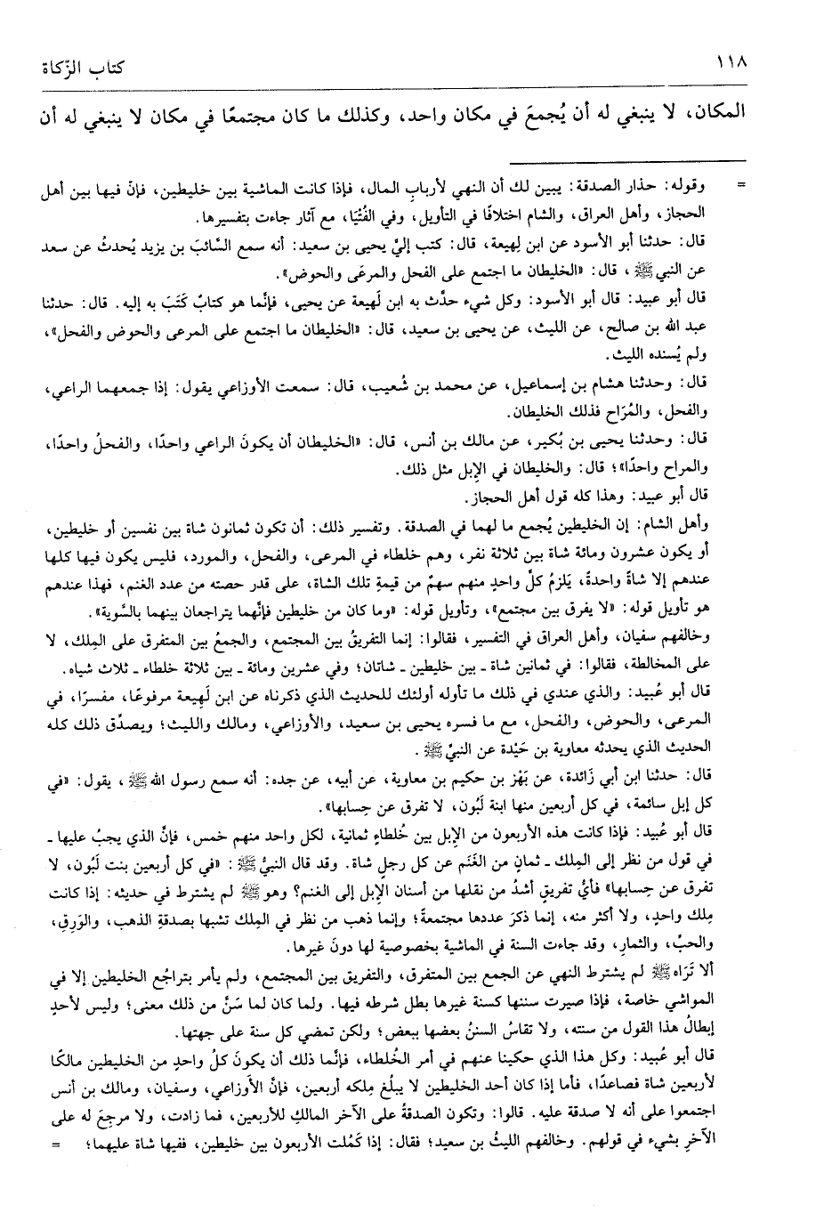 قال أبو عُبيد: فإذا كانت هذه الأربعون من الإِبل بين خلطاء ثمانية، لكل واحد منهم خمس، فإنَّ الذي يجبُ عليها -في قول من نظر إلى المِلك- ثمانٍ من الغَنَم عن كل رجلٍ شاة. وقد قال النبيُّ - صلى الله عليه وسلم -: "في كل أربعين بنت لَبُون، لا تفرق عن حِسابها" فأيُّ تفريقٍ أشدُ من نقلها من أسنان الإِبل إلى الغنم؟ وهو - صلى الله عليه وسلم - لم يشترط في حديثه: إذا كانت مِلك واحدٍ، ولا أكثر منه، إنما ذكرَ عددها مجتمعةً؛ وإنما ذهب من نظر في المِلك تشبها بصدقةِ الذهب، والوَرِقِ، والحب، والثمارِ، وقد جاءت السنة في الماشية بخصوصية لها دونَ غيرها.