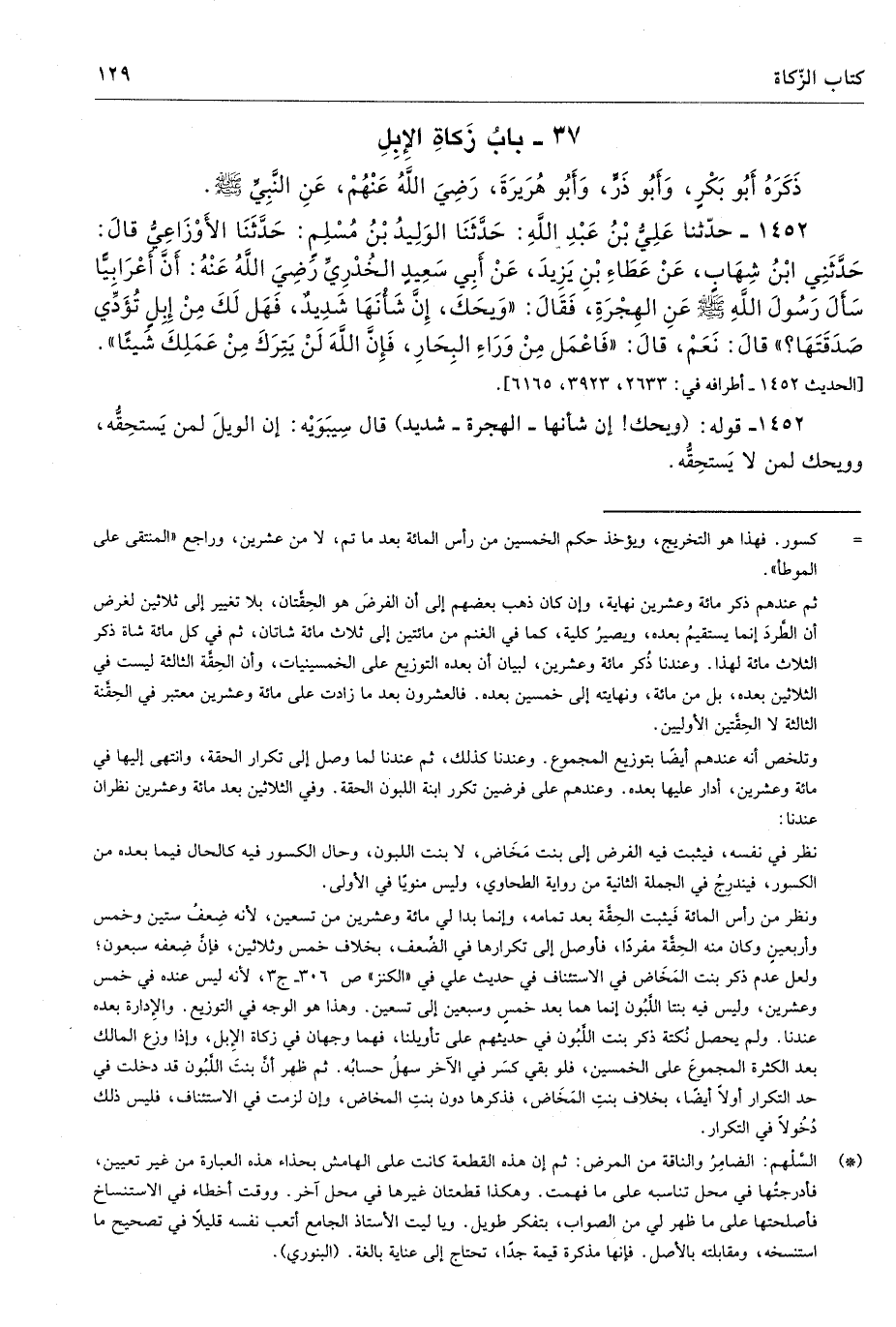 ونظر من رأس المائة فَيثبت الحِقَّة بعد تمامه، وإنما بدا لي مائة وعشرين من تسعين، لأنه ضِعفُ ستين وخمس وأربعين وكان منه الحِقَّة مفردًا، فأوصل إلى تكرارها في الضِّعف، بخلاف خمس وثلاثين، فإنَّ ضِعفه سبعون؛ ولعل عدم ذكر بنت المَخَاض في الاستئناف في حديث علي في "الكنز" ص 306 - ج 3، لأنه ليس عنده في خمس وعشرين، وليس فيه بنتا اللَّبُون إنما هما بعد خمسٍ وسبعين إلى تسعين. وهذا هو الوجه في التوزيع. والإِدارة بعده عندنا. ولم يحصل نُكتة ذكر بنت اللَّبُون في حديثهم على تأويلنا، فهما وجهان في زكاة الإِبل، وإذا وزع المالك بعد الكثرة المجموعَ على الخمسين، فلو بقي كسَر في الآخر سهلُ حسابُه. ثم ظهر أنَّ بنتَ اللَّبُون قد دخلت في حد التكرار أولًا أيضًا، بخلاف بنتِ المَخَاض، فذكرها دون بنتِ المخاض، وإن لزمت في الاستئناف، فليس ذلك دُخُولًا في التكرار.
