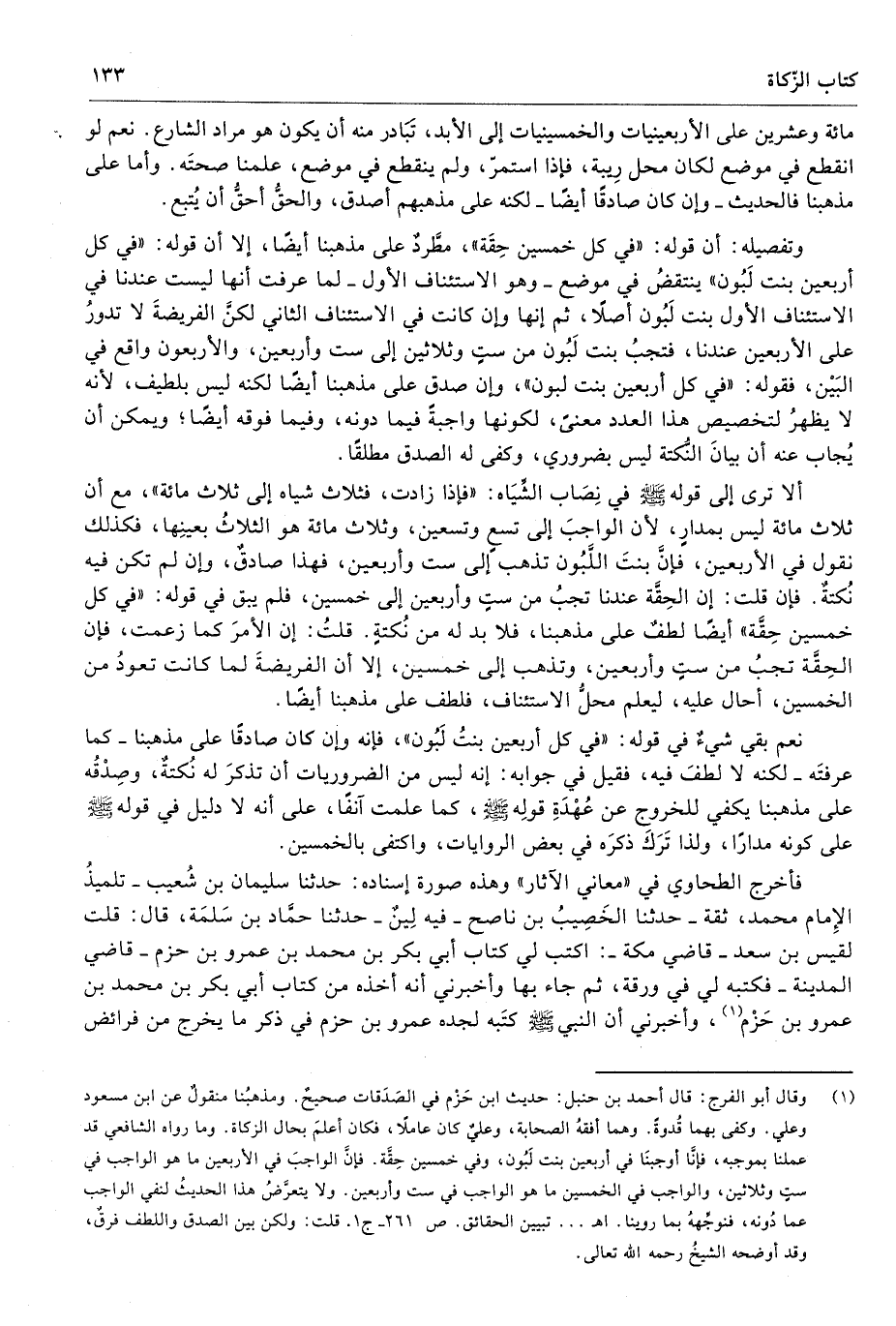 (¬1) وقال أبو الفرج: قال أحمد بن حنبل: حديث ابن حَزْم في الصَدَقات صحيحٌ. ومذهبُنا منقولٌ عن ابن مسعود وعلي. وكفى بهما قُدوةً. وهما أفقهُ الصحابة، وعليٌ كان عاملًا، فكان أعلمَ بحال الزكاة. وما رواه الشافعي قد عملنا بموجبه، فإنَّا أوجبنَا في أربعين بنت لَبُون، وفي خمسين حِقَّة. فإنَّ الواجبَ في الأربعين ما هو الواجب في ستٍ وثلاثين، والواجب في الخمسين ما هو الواجب في ست وأربعين. ولا يتعرَّضُ هذا الحديثُ لنفي الواجب عما دُونه، فنوجِّههُ بما روينا. اهـ ... تبيين الحقائق. ص 261 - ج 1. قلت: ولكن بين الصدق واللطف فرقٌ، وقد أوضحه الشيخُ رحمه الله تعالى.