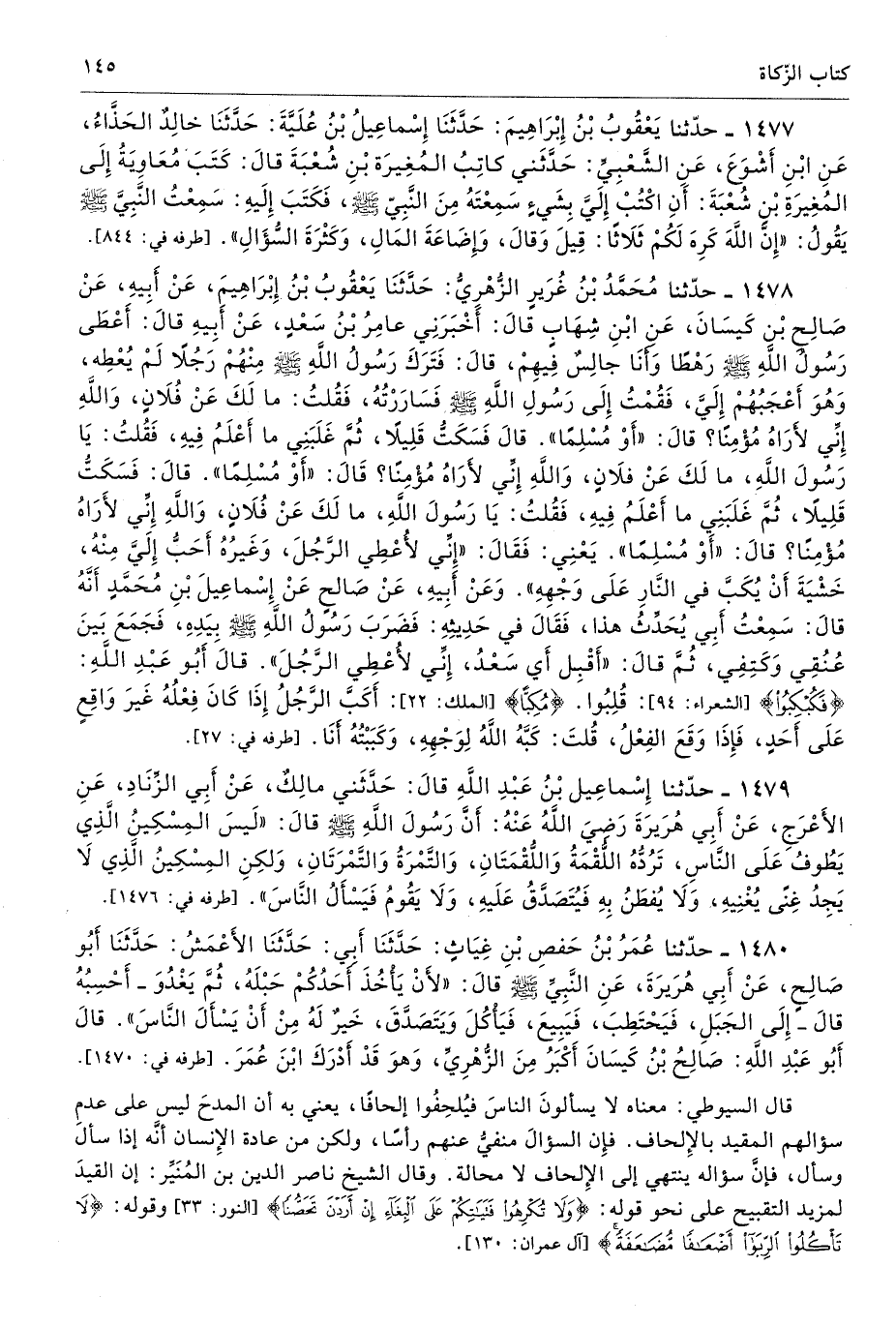 1478 - حَدَّثَنَا مُحَمَّدُ بْنُ غُرَيْرٍ الزُّهْرِىُّ حَدَّثَنَا يَعْقُوبُ بْنُ إِبْرَاهِيمَ عَنْ أَبِيهِ عَنْ صَالِحِ بْنِ كَيْسَانَ عَنِ ابْنِ شِهَابٍ قَالَ أَخْبَرَنِى عَامِرُ بْنُ سَعْدٍ عَنْ أَبِيهِ قَالَ أَعْطَى رَسُولُ اللَّهِ - صلى الله عليه وسلم - رَهْطًا وَأَنَا جَالِسٌ فِيهِمْ قَالَ فَتَرَكَ رَسُولُ اللَّهِ - صلى الله عليه وسلم - مِنْهُمْ رَجُلاً لَمْ يُعْطِهِ، وَهُوَ أَعْجَبُهُمْ إِلَىَّ، فَقُمْتُ إِلَى رَسُولِ اللَّهِ - صلى الله عليه وسلم - فَسَارَرْتُهُ فَقُلْتُ مَا لَكَ عَنْ فُلاَنٍ وَاللَّهِ إِنِّى لأُرَاهُ مُؤْمِنًا. قَالَ «أَوْ مُسْلِمًا» قَالَ فَسَكَتُّ قَلِيلاً ثُمَّ غَلَبَنِى مَا أَعْلَمُ فِيهِ فَقُلْتُ يَا رَسُولَ اللَّهِ. مَا لَكَ عَنْ فُلاَنٍ وَاللَّهِ إِنِّى لأُرَاهُ مُؤْمِنًا. قَالَ «أَوْ مُسْلِمًا». قَالَ فَسَكَتُّ قَلِيلاً ثُمَّ غَلَبَنِى مَا أَعْلَمُ فِيهِ فَقُلْتُ يَا رَسُولَ اللَّهِ مَا لَكَ عَنْ فُلاَنٍ وَاللَّهِ إِنِّى لأُرَاهُ مُؤْمِنًا. قَالَ «أَوْ مُسْلِمًا - يَعْنِى فَقَالَ - إِنِّى لأُعْطِى الرَّجُلَ وَغَيْرُهُ أَحَبُّ إِلَىَّ مِنْهُ، خَشْيَةَ أَنْ يُكَبَّ فِى النَّارِ عَلَى وَجْهِهِ». وَعَنْ أَبِيهِ عَنْ صَالِحٍ عَنْ إِسْمَاعِيلَ بْنِ مُحَمَّدٍ أَنَّهُ قَالَ سَمِعْتُ أَبِى يُحَدِّثُ هَذَا فَقَالَ فِى حَدِيثِهِ فَضَرَبَ رَسُولُ اللَّهِ - صلى الله عليه وسلم - بِيَدِهِ فَجَمَعَ بَيْنَ عُنُقِى وَكَتِفِى ثُمَّ قَالَ «أَقْبِلْ أَىْ سَعْدُ إِنِّى لأُعْطِى الرَّجُلَ». قَالَ أَبُو عَبْدِ اللَّهِ {فَكُبْكِبُوا} [الشعراء: 94] قُلِبُوا {مُكِبًّا} [الملك: 22] أَكَبَّ الرَّجُلُ إِذَا كَانَ فِعْلُهُ غَيْرَ وَاقِعٍ عَلَى أَحَدٍ، فَإِذَا وَقَعَ الْفِعْلُ قُلْتَ كَبَّهُ اللَّهُ لِوَجْهِهِ، وَكَبَبْتُهُ أَنَا. طرفه 27 - تحفة 3891، 3921 - 154/ 2
