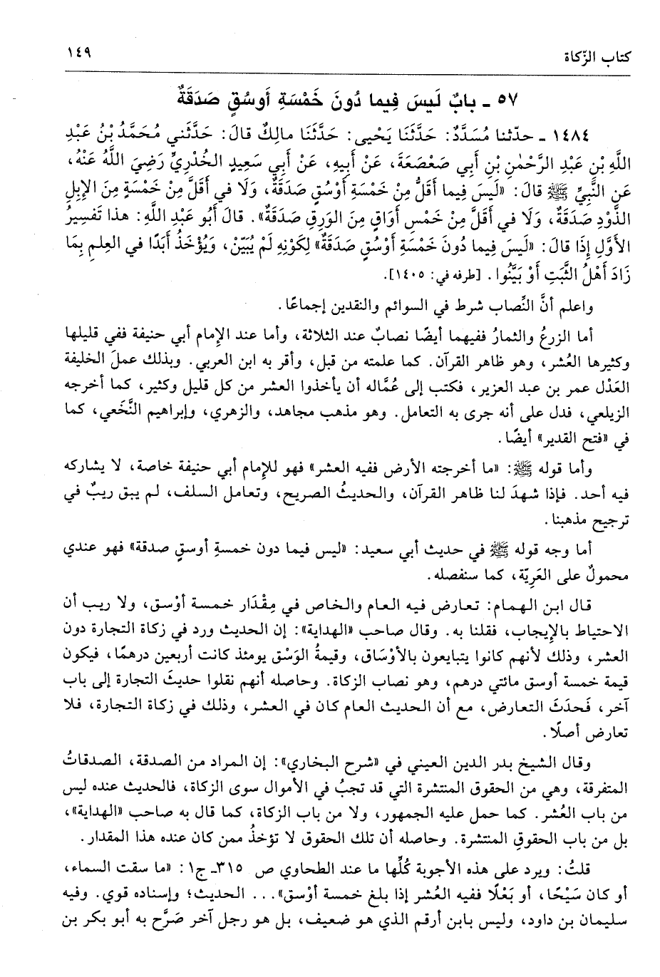 قال ابن الهمام: تعارض فيه العام والخاص في مِقْدَار خمسة أوْسق، ولا ريب أن الاحتياط بالإِيجاب، فقلنا به. وقال صاحب «الهداية»: إن الحديث ورد في زكاة التجارة دون العشر، وذلك لأنهم كانوا يتبايعون بالأوْسَاق، وقيمةُ الوَسْق يومئذ كانت أربعين درهمًا، فيكون قيمة خمسة أوسق مئتي درهم، وهو نصاب الزكاة. وحاصله أنهم نقلوا حديثَ التجارة إلى باب آخر، فَحدَثَ التعارض، مع أن الحديث العام كان في العشر، وذلك في زكاة التجارة، فلا تعارض أصلا.