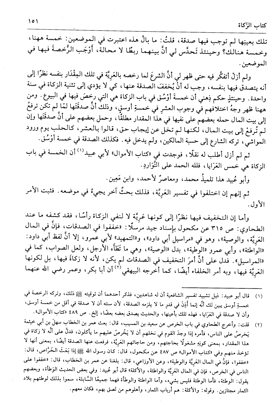 (¬2) قلت: وأخرج الطحاوي في باب الخرص عن سعيد بن المسيب، قال: بعث عمر بن الخطاب سهلَ بن أبي خيثمة يَخرصُ على الناس، فأمره إذا وجدَ القوم في نخلهم أن لا يَخرصْ عليهم ما يأكلون، فدلَّ على أنَّه لا زكاة في هذا المقدار، بمعنى كونِهِ مشغولًا بحاجتهم، ومن حاجاتهم العَرِيَّة، فرفعت عنها الصدقة أيضًا، بمعنى أنها لا تؤخذ منهم وفي "كتاب الأموال" ص 487 عن مكحول، قال: كان رسول الله - صلى الله عليه وسلم - إذا بَعَثَ الخَرَّاص، قال: "خففوا، فإنَّ في المال العَرِيَّة والوطية"، وعن الأوزاعي، قال: بلغنا عن عمر بن الخطاب، قال: "خففوا على الناس في الخرص، فإن في المال العَرِيَّة والواطئة، والأكلة" قال أبو عُبيد: وفي بعض الحديث الوَطأة، وبعضهم يقول: الوطئة، فأما الوطئة فليس بشيء، وأما الواطئة والوطأة فهما جميعًا السَّابلة، سموا بذلك لوطئهم بلاد الثمار مجتازين. وقوله: والأكلة: هم أرباب الثمار، وأهلوهم من لصق بهم، فكان معهم.