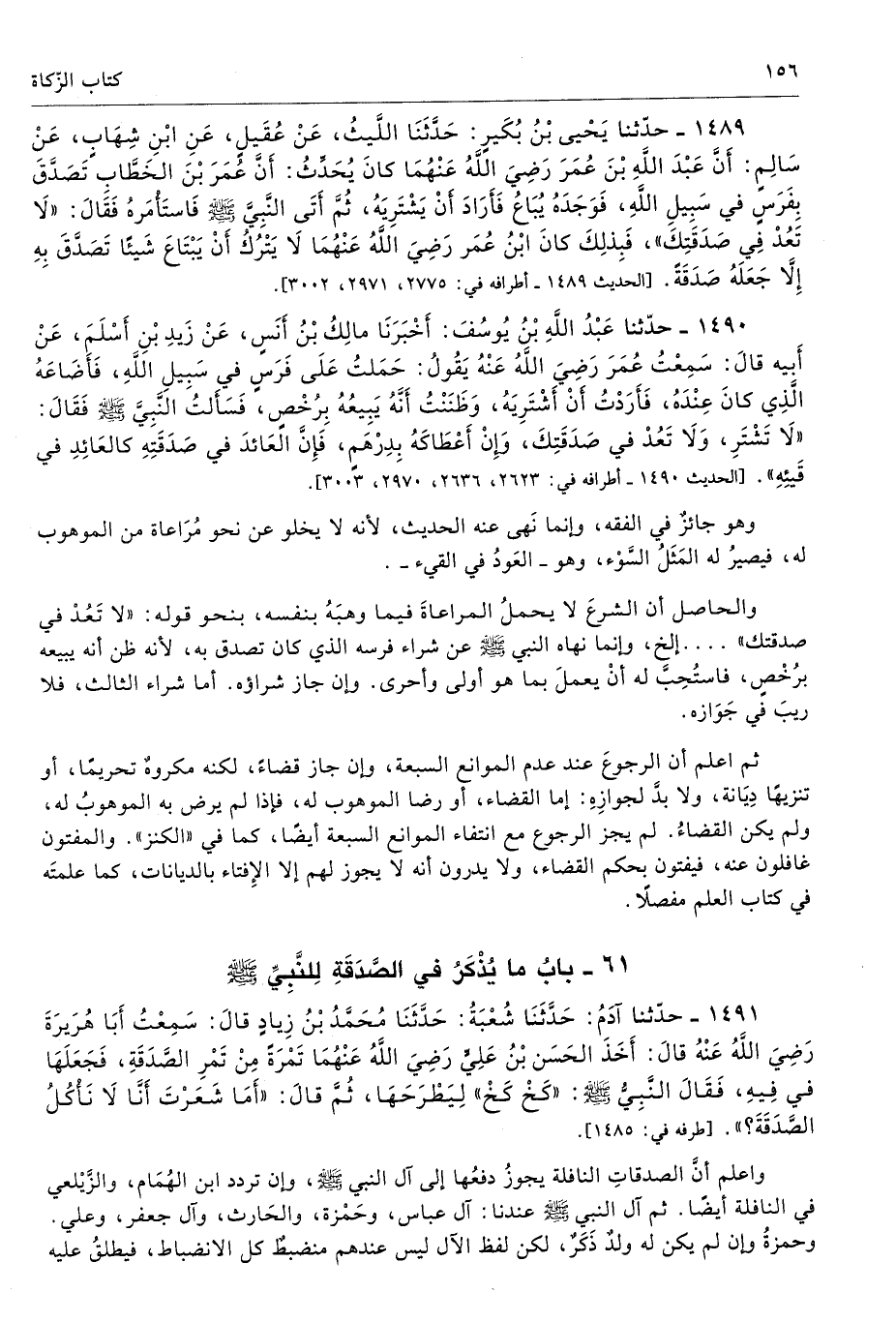 1490 - حَدَّثَنَا عَبْدُ اللَّهِ بْنُ يُوسُفَ أَخْبَرَنَا مَالِكُ بْنُ أَنَسٍ عَنْ زَيْدِ بْنِ أَسْلَمَ عَنْ أَبِيهِ قَالَ سَمِعْتُ عُمَرَ - رضى الله عنه - يَقُولُ حَمَلْتُ عَلَى فَرَسٍ فِى سَبِيلِ اللَّهِ، فَأَضَاعَهُ الَّذِى كَانَ عِنْدَهُ، فَأَرَدْتُ أَنْ أَشْتَرِيَهُ، وَظَنَنْتُ أَنَّهُ يَبِيعُهُ بِرُخْصٍ، فَسَأَلْتُ النَّبِىَّ - صلى الله عليه وسلم - فَقَالَ «لاَ تَشْتَرِ وَلاَ تَعُدْ فِى صَدَقَتِكَ، وَإِنْ أَعْطَاكَهُ بِدِرْهَمٍ، فَإِنَّ الْعَائِدَ فِى صَدَقَتِهِ كَالْعَائِدِ فِى قَيْئِهِ». أطرافه 2623، 2636، 2970، 3003 - تحفة 10385