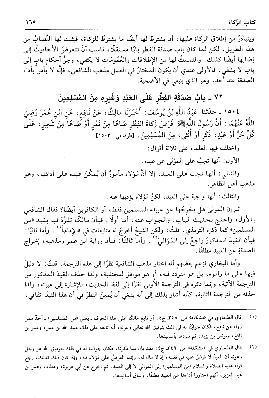 (¬2) قال الطحاوي في "مشكله" ص 349 - ج 4: فقد بان بما ذكرنا، فكان جوابُنا له في ذلك بتوفيق الله عز وجل وعونه أن العبدَ لا فرضَ عليه في نفسه، إذ لا مال له، وإنما الفرضُ على مَوْلاه فيه، وإذا كان ذلك كذلك، رجع قوله عليه الصلاة والسلام "من المسلمين" إلى الموالي لا إلى العبيد. ثم أخرج عن أبي هريرة، وعطاء، وعمر بن عبد العزيز، أنهم اختاروا أداءها عن العبيد مطلقًا، وساق أسانيدها.