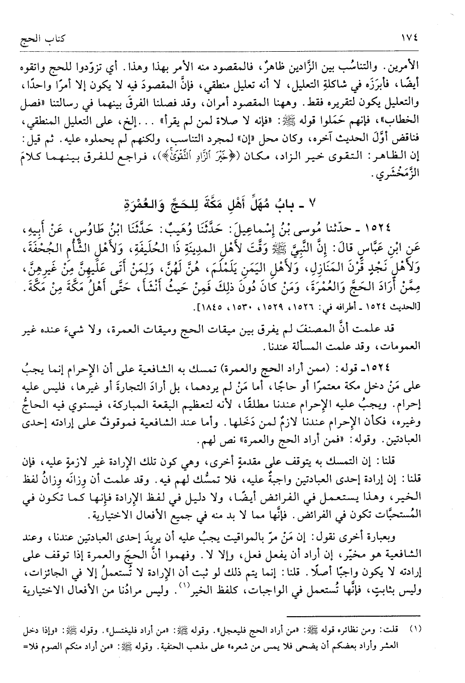 وبعبارة أخرى نقول: إن مَنْ مرّ بالمواقيت يجبُ عليه أن يريدَ إحدى العبادتين عندنا، وعند الشافعية هو مخيّر، إن أراد أن يفعل فعل، وإلا لا. وفهموا أنَّ الحجَ والعمرة إذا توقف على إرادته لا يكون واجبًا أصلا. قلنا: إنما يتم ذلك لو ثبت أن الإِرادة لا تُستعملُ إلا في الجائزات، وليس بثابتٍ، فإنَّها تُستعمل في الواجبات، كلفظ الخير (¬1). وليس مرادُنا من الأفعال الاختيارية