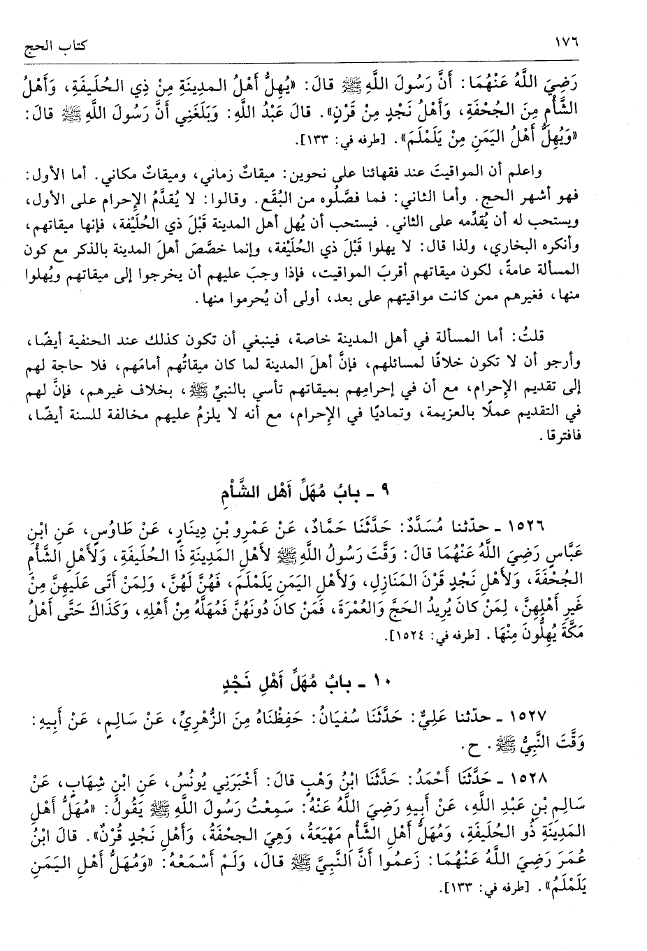 - رضى الله عنهما - أَنَّ رَسُولَ اللَّهِ - صلى الله عليه وسلم - قَالَ «يُهِلُّ أَهْلُ الْمَدِينَةِ مِنْ ذِى الْحُلَيْفَةِ، وَأَهْلُ الشَّأْمِ مِنَ الْجُحْفَةِ، وَأَهْلُ نَجْدٍ مِنْ قَرْنٍ». قَالَ عَبْدُ اللَّهِ وَبَلَغَنِى أَنَّ رَسُولَ اللَّهِ - صلى الله عليه وسلم - قَالَ «وَيُهِلُّ أَهْلُ الْيَمَنِ مِنْ يَلَمْلَمَ». أطرافه 133، 1522، 1527، 1528، 7344 - تحفة 8326