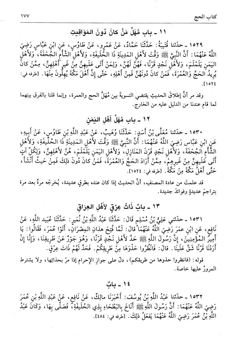 1529 - حَدَّثَنَا قُتَيْبَةُ حَدَّثَنَا حَمَّادٌ عَنْ عَمْرٍو عَنْ طَاوُسٍ عَنِ ابْنِ عَبَّاسٍ - رضى الله عنهما - أَنَّ النَّبِىَّ - صلى الله عليه وسلم - وَقَّتَ لأَهْلِ الْمَدِينَةِ ذَا الْحُلَيْفَةِ، وَلأَهْلِ الشَّأْمِ الْجُحْفَةَ، وَلأَهْلِ الْيَمَنِ يَلَمْلَمَ، وَلأَهْلِ نَجْدٍ قَرْنًا، فَهُنَّ لَهُنَّ وَلِمَنْ أَتَى عَلَيْهِنَّ مِنْ غَيْرِ أَهْلِهِنَّ، مِمَّنْ كَانَ يُرِيدُ الْحَجَّ وَالْعُمْرَةَ فَمَنْ كَانَ دُونَهُنَّ فَمِنْ أَهْلِهِ حَتَّى إِنَّ أَهْلَ مَكَّةَ يُهِلُّونَ مِنْهَا. أطرافه 1524، 1526، 1530، 1845 - تحفة 5738