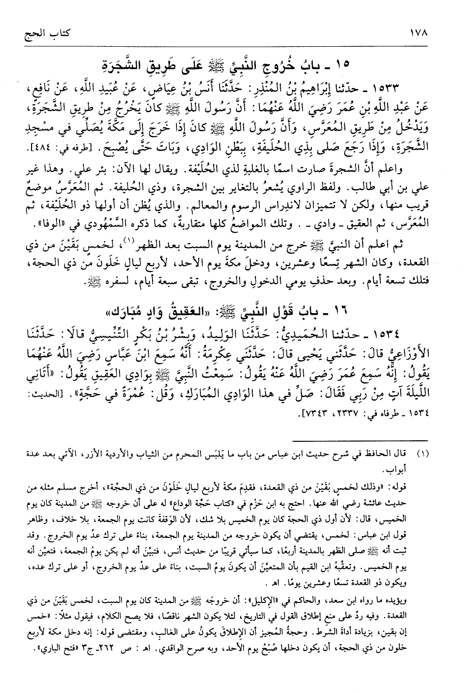 1533 - حَدَّثَنَا إِبْرَاهِيمُ بْنُ الْمُنْذِرِ حَدَّثَنَا أَنَسُ بْنُ عِيَاضٍ عَنْ عُبَيْدِ اللَّهِ عَنْ نَافِعٍ عَنْ عَبْدِ اللَّهِ بْنِ عُمَرَ - رضى الله عنهما - أَنَّ رَسُولَ اللَّهِ - صلى الله عليه وسلم - كَانَ يَخْرُجُ مِنْ طَرِيقِ الشَّجَرَةِ، وَيَدْخُلُ مِنْ طَرِيقِ الْمُعَرَّسِ، وَأَنَّ رَسُولَ اللَّهِ - صلى الله عليه وسلم - كَانَ إِذَا خَرَجَ إِلَى مَكَّةَ يُصَلِّى فِى مَسْجِدِ الشَّجَرَةِ، وَإِذَا رَجَعَ صَلَّى بِذِى الْحُلَيْفَةِ بِبَطْنِ الْوَادِى، وَبَاتَ حَتَّى يُصْبِحَ. أطرافه 484، 1532، 1799 - تحفة 7801، 7803 - 167/ 2