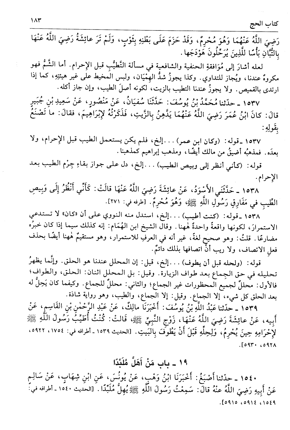 1538 - حَدَّثَنِى الأَسْوَدُ عَنْ عَائِشَةَ - رضى الله عنها - قَالَتْ كَأَنِّى أَنْظُرُ إِلَى وَبِيصِ الطِّيبِ فِى مَفَارِقِ رَسُولِ اللَّهِ - صلى الله عليه وسلم - وَهُوَ مُحْرِمٌ. أطرافه 271، 5918، 5923 - تحفة 15988