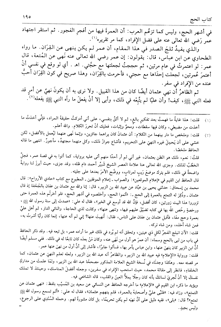 قلت: ورواية "الإِعلام" فيه عبيد الله بن الزبير، والظاهرُ أنه عبد الله بن الزبير، ولعله تعلم النهيَ عن عثمان، كما مر قصته معه. وهكذا وجدنَاه في نُسخة الشيخ العلامة المذكور مصححًا عبد الله بن الزبير، ولمّا علمتَ من مداركِ الخلفاءِ، فانظر إلى مقالة محمد، حيث استحب الإِفراد في سفرين، وجعله أفضلَ المناسك، وحينئذ لا تملك نفسكَ إلا أنْ تُجريَ لسانكَ بأنه كان رجلًا يملأ العينَ والقلب، قاله الشافعي فيه.