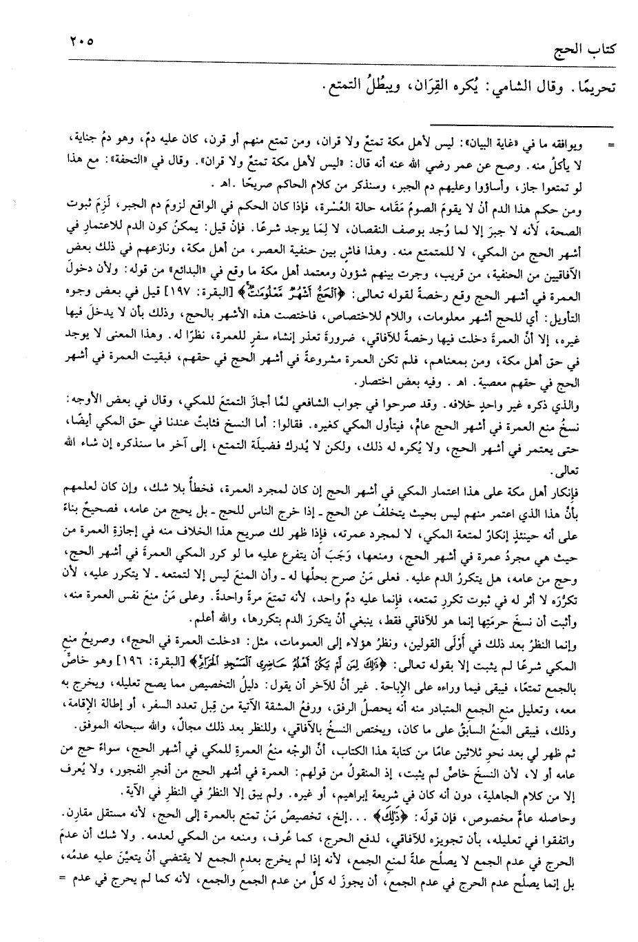 ومن حكم هذا الدم أن لا يقومَ الصومُ مَقَامه حالة العُسرة، فإذا كان الحكم في الواقع لزومَ دم الجبر، لَزِمَ ثبوت الصحة، لأنه لا جبرَ إلا لما وُجد بوصف النقصان، لا لِمَا يوجد شرعًا. فإن قيل: يمكنُ كون الدم للاعتمار في أشهر الحج من المكي، لا للمتمتع منه. وهذا فاشٍ بين حنفية العصر، من أهل مكة، ونازعهم في ذلك بعض الآفاقيين من الحنفية، من قريب، وجرت بينهم شؤون ومعتمد أهل مكة ما وقع في "البدائع" من قوله: ولأن دخولَ المرة في أشهر الحج وقع رخصة لقوله تعالى: {الْحَجُّ أَشْهُرٌ مَعْلُومَاتٌ} [البقرة: 197] قيل في بعض وجوه التأويل: أي للحج أشهر معلومات، واللام للاختصاص، فاختصت هذه الأشهر بالحج، وذلك بأن لا يدخلَ فيها غيره، إلا أنَّ العمرةَ دخلت فيها رخصة للآفاقي، ضرورةَ تعذر إنشاء سفرٍ للعمرة، نظرًا له. وهذا المعنى لا يوجد في حق أهل مكة، ومن بمعناهم، فلم تكن العمرة مشروعة في أشهر الحج في حقهم، فبقيت العمرة في أشهر الحج في حقهم معصية. اهـ. وفيه بعض اختصار.