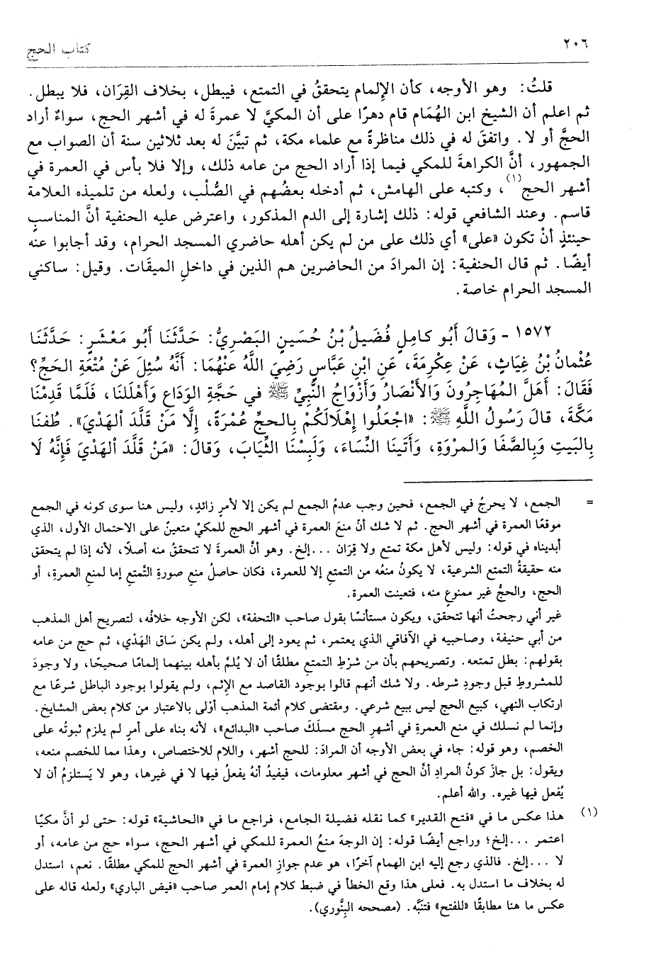 (¬1) هذا عكس ما في "فتح القدير" كما نقله فضيلة الجامع، فراجع ما في "الحاشية" قوله: حتى لو أنَّ مكيًا اعتمر ... إلخ؛ وراجع أيضًا قوله: إن الوجهَ منعُ العمرة للمكي في أشهر الحج، سواء حج من عامه، أو لا ... إلخ. فالذي رجع إليه ابن الهمام آخرًا، هو عدم جوازِ العمرة في أشهر الحج للمكي مطلقًا. نعم، استدل له بخلاف ما استدل به. فعلى هذا وقع الخطأ في ضبط كلام إمام العمر صاحب "فيض الباري" ولعله قاله على عكس ما هنا مطابقًا "للفتح" فتنَبَّه. (مصححه البِنَّوري).