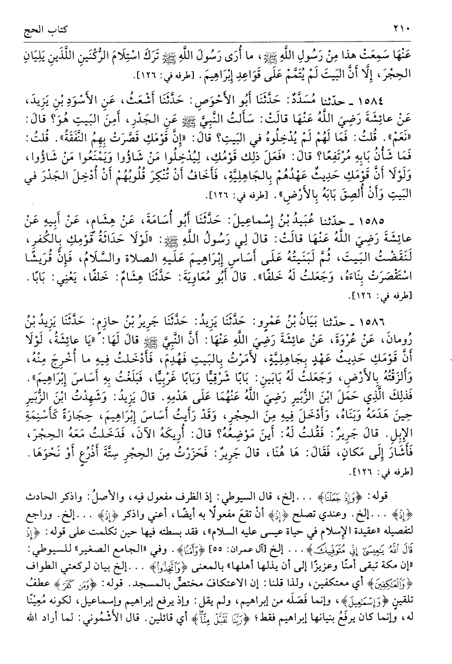 عنها - سَمِعَتْ هَذَا مِنْ رَسُولِ اللَّهِ - صلى الله عليه وسلم - مَا أُرَى رَسُولَ اللَّهِ - صلى الله عليه وسلم - تَرَكَ اسْتِلاَمَ الرُّكْنَيْنِ اللَّذَيْنِ يَلِيَانِ الْحِجْرَ، إِلاَّ أَنَّ الْبَيْتَ لَمْ يُتَمَّمْ عَلَى قَوَاعِدِ إِبْرَاهِيمَ. أطرافه 126، 1584، 1585، 1586، 3368، 4484، 7243 - تحفة 16287، 6912