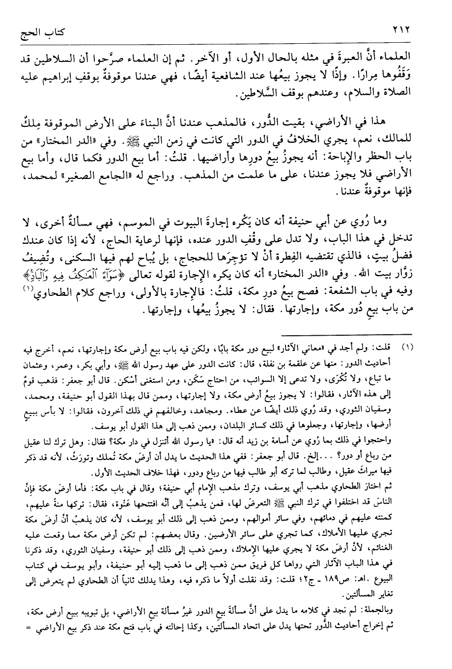 (¬1) قلت: ولم أجد في "معاني الآثار" لبيع دور مكة بابًا، ولكن فيه باب بيع أرض مكة وإجارتها، نعم، أخرج فيه أحاديث الدور: منها عن علقمة بن نفلة، قال: كانت الدور على عهد رسول الله - صلى الله عليه وسلم -، وأبي بكر، وعمر، وعثمان ما تباع، ولا تُكْرَى، ولا تدعى إلا السوائب، من احتاج سَكَن، ومن استغنى أسْكن. قال أبو جعفر: فذهب قومٌ إلى هذه الآثار، فقالوا: لا يجوز بيعُ أرض مكة، ولا إجارتها، وممن قال بهذا القول أبو حنيفة، ومحمد، وسفيان الثوري، وقد رُوي ذلك أيضًا عن عطاء. ومجاهد، وخالفهم في ذلك آخرون، فقالوا: لا بأس ببيعٍ أرضها، وإجارتها، وجعلوها في ذلك كسائر البلدان، وممن ذهب إلى هذا القول أبو يوسف.