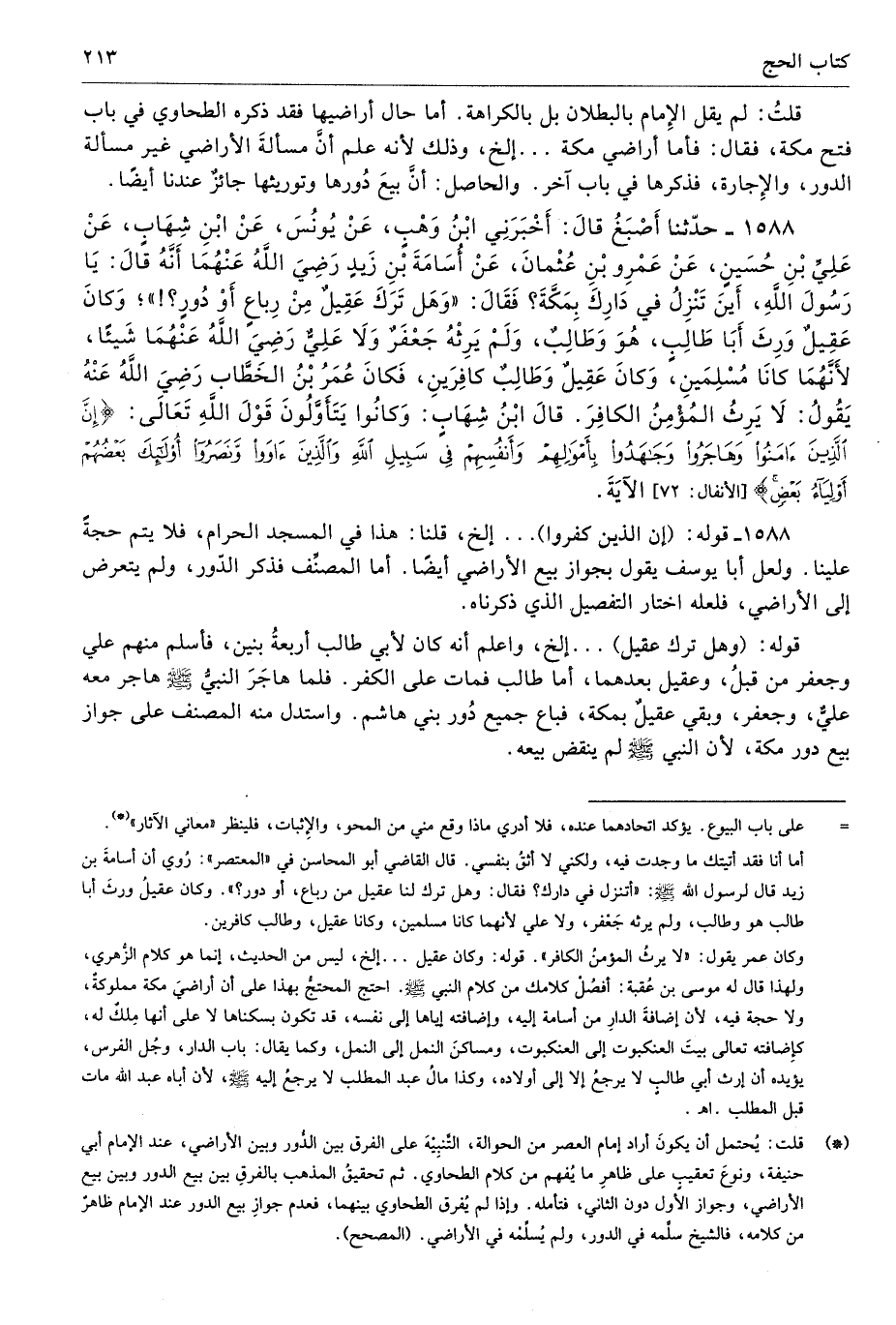 1588 - حَدَّثَنَا أَصْبَغُ قَالَ أَخْبَرَنِى ابْنُ وَهْبٍ عَنْ يُونُسَ عَنِ ابْنِ شِهَابٍ عَنْ عَلِىِّ بْنِ حُسَيْنٍ عَنْ عَمْرِو بْنِ عُثْمَانَ عَنْ أُسَامَةَ بْنِ زَيْدٍ - رضى الله عنهما - أَنَّهُ قَالَ يَا رَسُولَ اللَّهِ، أَيْنَ تَنْزِلُ فِى دَارِكَ بِمَكَّةَ. فَقَالَ «وَهَلْ تَرَكَ عَقِيلٌ مِنْ رِبَاعٍ أَوْ دُورٍ». وَكَانَ عَقِيلٌ وَرِثَ أَبَا طَالِبٍ هُوَ وَطَالِبٌ وَلَمْ يَرِثْهُ جَعْفَرٌ وَلاَ عَلِىٌّ - رضى الله عنهما - شَيْئًا لأَنَّهُمَا كَانَا مُسْلِمَيْنِ، وَكَانَ عَقِيلٌ وَطَالِبٌ كَافِرَيْنِ، فَكَانَ عُمَرُ بْنُ الْخَطَّابِ - رضى الله عنه - يَقُولُ لاَ يَرِثُ الْمُؤْمِنُ الْكَافِرَ. قَالَ ابْنُ شِهَابٍ وَكَانُوا يَتَأَوَّلُونَ قَوْلَ اللَّهِ تَعَالَى {إِنَّ الَّذِينَ آمَنُوا وَهَاجَرُوا وَجَاهَدُوا بِأَمْوَالِهِمْ وَأَنْفُسِهِمْ فِي سَبِيلِ اللَّهِ وَالَّذِينَ آوَوْا وَنَصَرُوا أُولَئِكَ بَعْضُهُمْ أَوْلِيَاءُ بَعْضٍ} [الأنفال: 72] الآيَةَ. أطرافه 3058، 4282، 6764 - تحفة 114