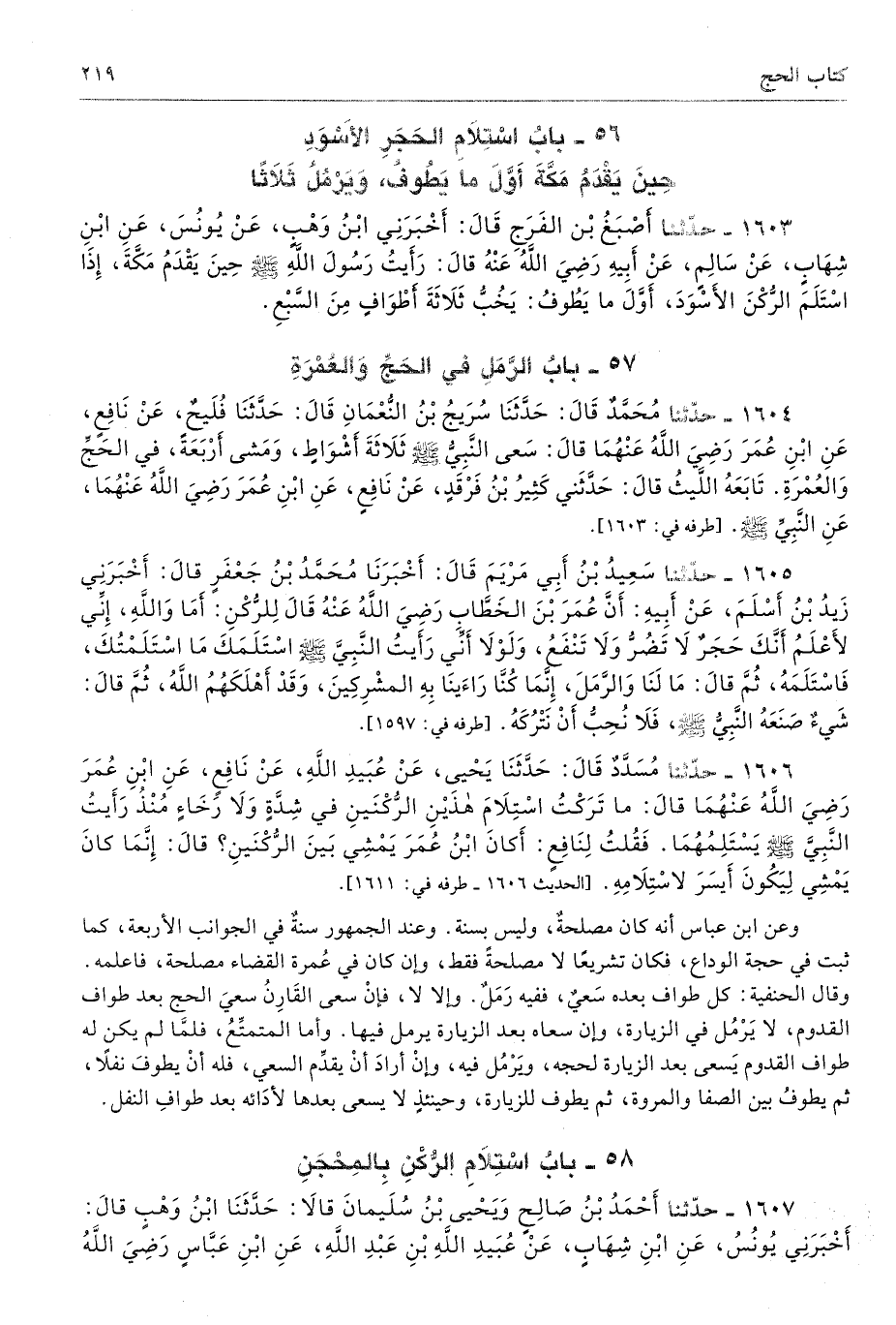 1603 - حَدَّثَنَا أَصْبَغُ بْنُ الْفَرَجِ أَخْبَرَنِى ابْنُ وَهْبٍ عَنْ يُونُسَ عَنِ ابْنِ شِهَابٍ عَنْ سَالِمٍ عَنْ أَبِيهِ - رضى الله عنه - قَالَ رَأَيْتُ رَسُولَ اللَّهِ - صلى الله عليه وسلم - حِينَ يَقْدَمُ مَكَّةَ، إِذَا اسْتَلَمَ الرُّكْنَ الأَسْوَدَ أَوَّلَ مَا يَطُوفُ يَخُبُّ ثَلاَثَةَ أَطْوَافٍ مِنَ السَّبْعِ. أطرافه 1604، 1616، 1617، 1644 - تحفة 6981