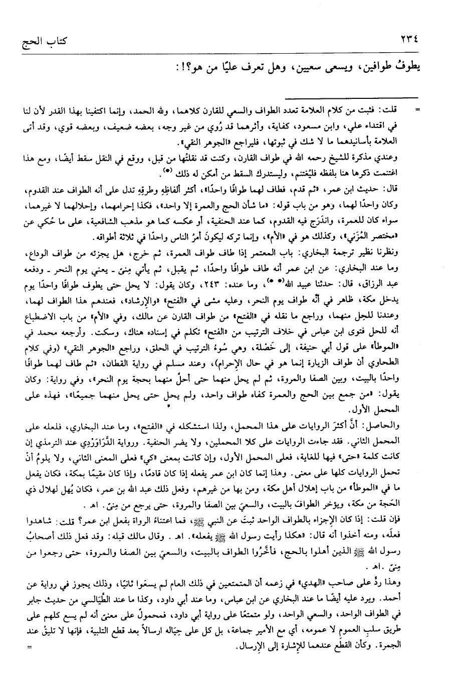 = قلت: فثبت من كلام العلامة تعدد الطواف والسعي للقارن كلاهما، ولله الحمد، وإنما اكتفينا بهذا القدر لأن لنا في اقتداء علي، وابن مسعود، كفاية، وأثرهما قد رُوي من غير وجه، بعضه ضعيف، وبعضه قوي، وقد أتى العلامة بأسانيدهما ما لا شك في ثبوتها، فليراجع "الجوهر النقي".
