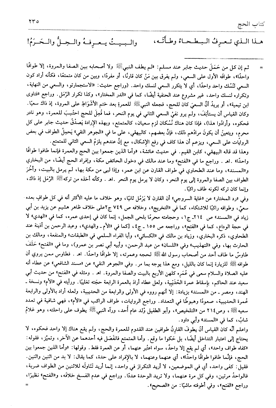 = ثم إن كل من حَمَلَ حديث جابر عند مسلم: "لم يطف النبي - صلى الله عليه وسلم - ولا أصحابه بين الصفا والمروة، إلا طوافًا واحدًا"، طوافَه الأول على السعي، ولم يفرق بين مَنْ كان قارنًا، أو مفردًا، وبين من كان متمتعًا، فكأنه أراد كون السعي لنُسُك واحد واحدًا، أي لا يتكرر السعي لنسك واحد. (وراجع حديث: "الاستجمارتو، والسعي من النهاية، وتكراره لنسك واحد، غير مشروع عند الحنفية أيضًا، كما في "الدر المختار"، وكذا تكرار الرَّمَل. وراجع "فتاوى ابن تيمية"، أو يريدُ أنَّ السعيَ كان للحج، فجعله النبي - صلى الله عليه وسلم - للعمرةِ بعد ختم الأشوَاط على المروة، إذ ذاك سعيًا.