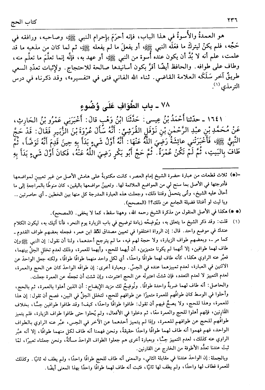 هو العمدةُ والأُسوةُ في هذا الباب، فإنه أحرَمَ بإِحرام النبي صلى الله عليه وسلّم وصاحبه، ورافقه في حَجِّه، فلم يكنْ ليتركَ ما فعَلَه النبي صلى الله عليه وسلّم أو يفعلَ ما لم يفعله صلى الله عليه وسلّم ثم لما كان من مذهبه ما قد علمت، علم أنه لا بُدَّ أن يكون عنده أُسوة من النبي صلى الله عليه وسلّم أو عهد به، فإنَّه إنما تعلَّمَ ما تعلَّم منه، وطاف على طوافه. والحافظ أيضًا أقرَّ بكون أسانيدها صالحة للاحتجاج. ولإِثبات تعدّدِ السعي طريقٌ آخر سَلَكَه العلامة القاضي. ثناء الله الفاني فتى في «تفسيره»، وقد ذكرناه في درس الترمذي (¬1).