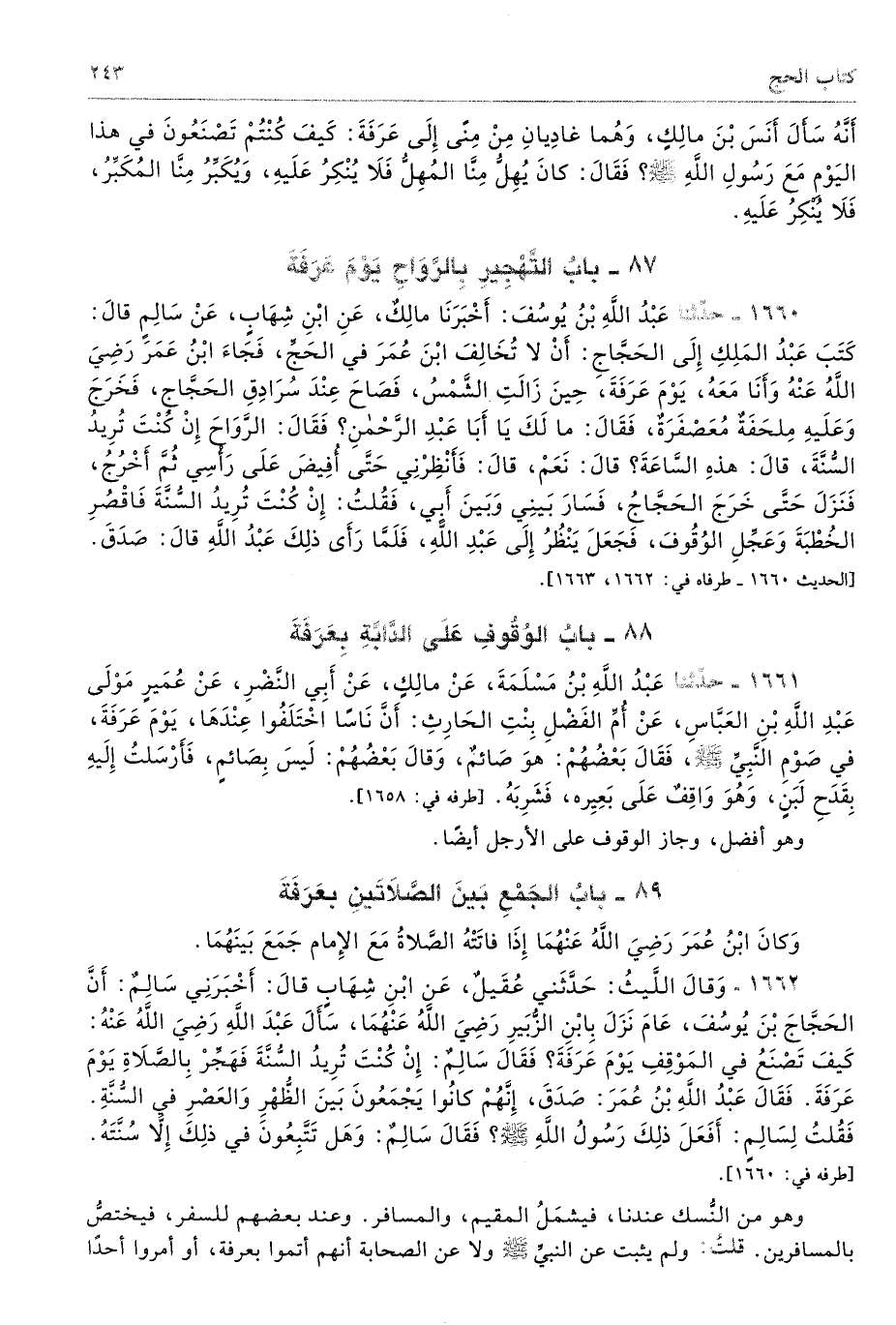 1662 - وَقَالَ اللَّيْثُ: حَدَّثَنِى عُقَيْلٌ عَنِ ابْنِ شِهَابٍ قَالَ أَخْبَرَنِى سَالِمٌ أَنَّ الْحَجَّاجَ بْنَ يُوسُفَ عَامَ نَزَلَ بِابْنِ الزُّبَيْرِ - رضى الله عنهما - سَأَلَ عَبْدَ اللَّهِ - رضى الله عنه - كَيْفَ تَصْنَعُ فِى الْمَوْقِفِ يَوْمَ عَرَفَةَ فَقَالَ سَالِمٌ إِنْ كُنْتَ تُرِيدُ السُّنَّةَ فَهَجِّرْ بِالصَّلاَةِ يَوْمَ عَرَفَةَ. فَقَالَ عَبْدُ اللَّهِ بْنُ عُمَرَ صَدَقَ. إِنَّهُمْ كَانُوا يَجْمَعُونَ بَيْنَ الظُّهْرِ وَالْعَصْرِ فِى السُّنَّةِ. فَقُلْتُ لِسَالِمٍ أَفَعَلَ ذَلِكَ رَسُولُ اللَّهِ - صلى الله عليه وسلم - فَقَالَ سَالِمٌ وَهَلْ تَتَّبِعُونَ فِى ذَلِكَ إِلاَّ سُنَّتَهُ طرفاه 1660، 1663 - تحفة 6916، 6890