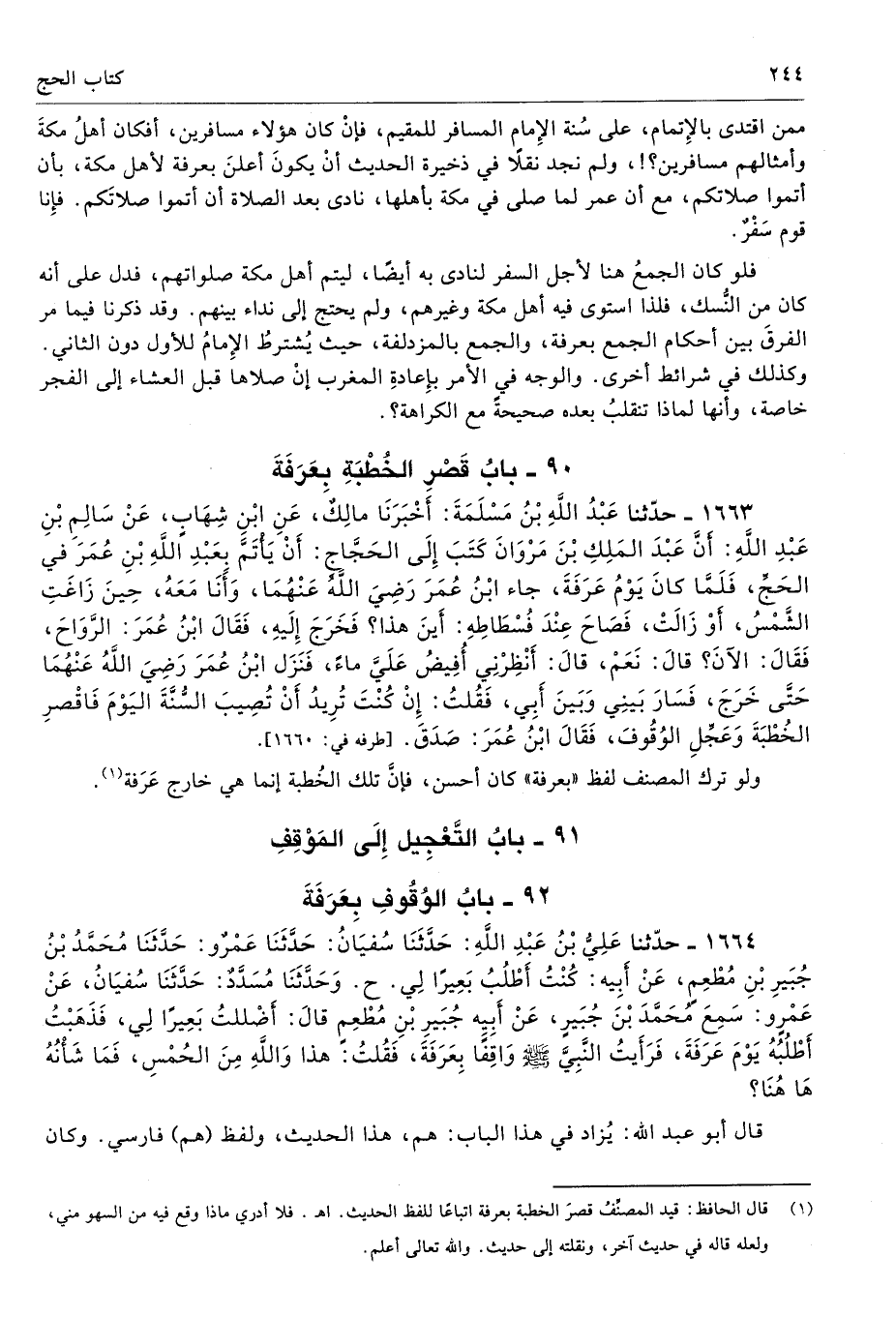 ممن اقتدى بالإِتمام، على سُنة الإِمام المسافر للمقيم، فإنْ كان هؤلاء مسافرين، أفكان أهلُ مكةَ وأمثالهم مسافرين؟، ولم نجد نقلا في ذخيرة الحديث أنْ يكونَ أعلنَ بعرفة لأهل مكة، بأن أتموا صلاتكم، مع أن عمر لما صلى في مكة بأهلها، نادى بعد الصلاة أن أتموا صلاتَكم. فإِنا قوم سَفْرٌ.