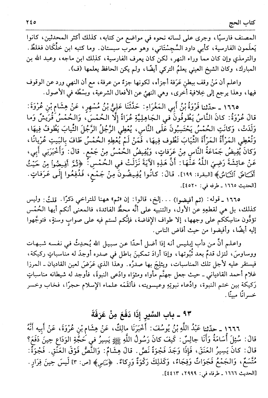 1665 - حَدَّثَنَا فَرْوَةُ بْنُ أَبِى الْمَغْرَاءِ حَدَّثَنَا عَلِىُّ بْنُ مُسْهِرٍ عَنْ هِشَامِ بْنِ عُرْوَةَ قَالَ عُرْوَةُ كَانَ النَّاسُ يَطُوفُونَ فِى الْجَاهِلِيَّةِ عُرَاةً إِلاَّ الْحُمْسَ، وَالْحُمْسُ قُرَيْشٌ وَمَا وَلَدَتْ، وَكَانَتِ الْحُمْسُ يَحْتَسِبُونَ عَلَى النَّاسِ يُعْطِى الرَّجُلُ الرَّجُلَ الثِّيَابَ يَطُوفُ فِيهَا، وَتُعْطِى الْمَرْأَةُ الْمَرْأَةَ الثِّيَابَ تَطُوفُ فِيهَا، فَمَنْ لَمْ يُعْطِهِ الْحُمْسُ طَافَ بِالْبَيْتِ عُرْيَانًا، وَكَانَ يُفِيضُ جَمَاعَةُ النَّاسِ مِنْ عَرَفَاتٍ، وَيُفِيضُ الْحُمْسُ مِنْ جَمْعٍ. قَالَ وَأَخْبَرَنِى أَبِى عَنْ عَائِشَةَ - رضى الله عنها - أَنَّ هَذِهِ الآيَةَ نَزَلَتْ فِى الْحُمْسِ {ثُمَّ أَفِيضُوا مِنْ حَيْثُ أَفَاضَ النَّاسُ} [البقرة: 199] قَالَ كَانُوا يُفِيضُونَ مِنْ جَمْعٍ فَدُفِعُوا إِلَى عَرَفَاتٍ. طرفه 4520 - تحفة 19020، 19024، 17111 - 200/ 2
