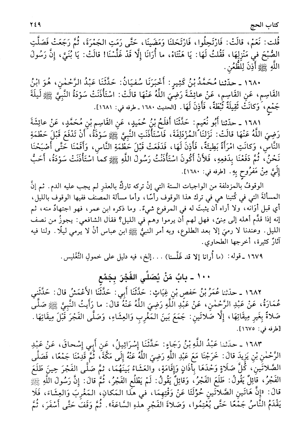 1681 - حَدَّثَنَا أَبُو نُعَيْمٍ حَدَّثَنَا أَفْلَحُ بْنُ حُمَيْدٍ عَنِ الْقَاسِمِ بْنِ مُحَمَّدٍ عَنْ عَائِشَةَ - رضى الله عنها - قَالَتْ نَزَلْنَا الْمُزْدَلِفَةَ فَاسْتَأْذَنَتِ النَّبِىَّ - صلى الله عليه وسلم - سَوْدَةُ أَنْ تَدْفَعَ قَبْلَ حَطْمَةِ النَّاسِ، وَكَانَتِ امْرَأَةً بَطِيئَةً، فَأَذِنَ لَهَا، فَدَفَعَتْ قَبْلَ حَطْمَةِ النَّاسِ، وَأَقَمْنَا حَتَّى أَصْبَحْنَا نَحْنُ، ثُمَّ دَفَعْنَا بِدَفْعِهِ، فَلأَنْ أَكُونَ اسْتَأْذَنْتُ رَسُولَ اللَّهِ - صلى الله عليه وسلم - كَمَا اسْتَأْذَنَتْ سَوْدَةُ أَحَبُّ إِلَىَّ مِنْ مَفْرُوحٍ بِهِ. طرفه 1680 - تحفة 17436