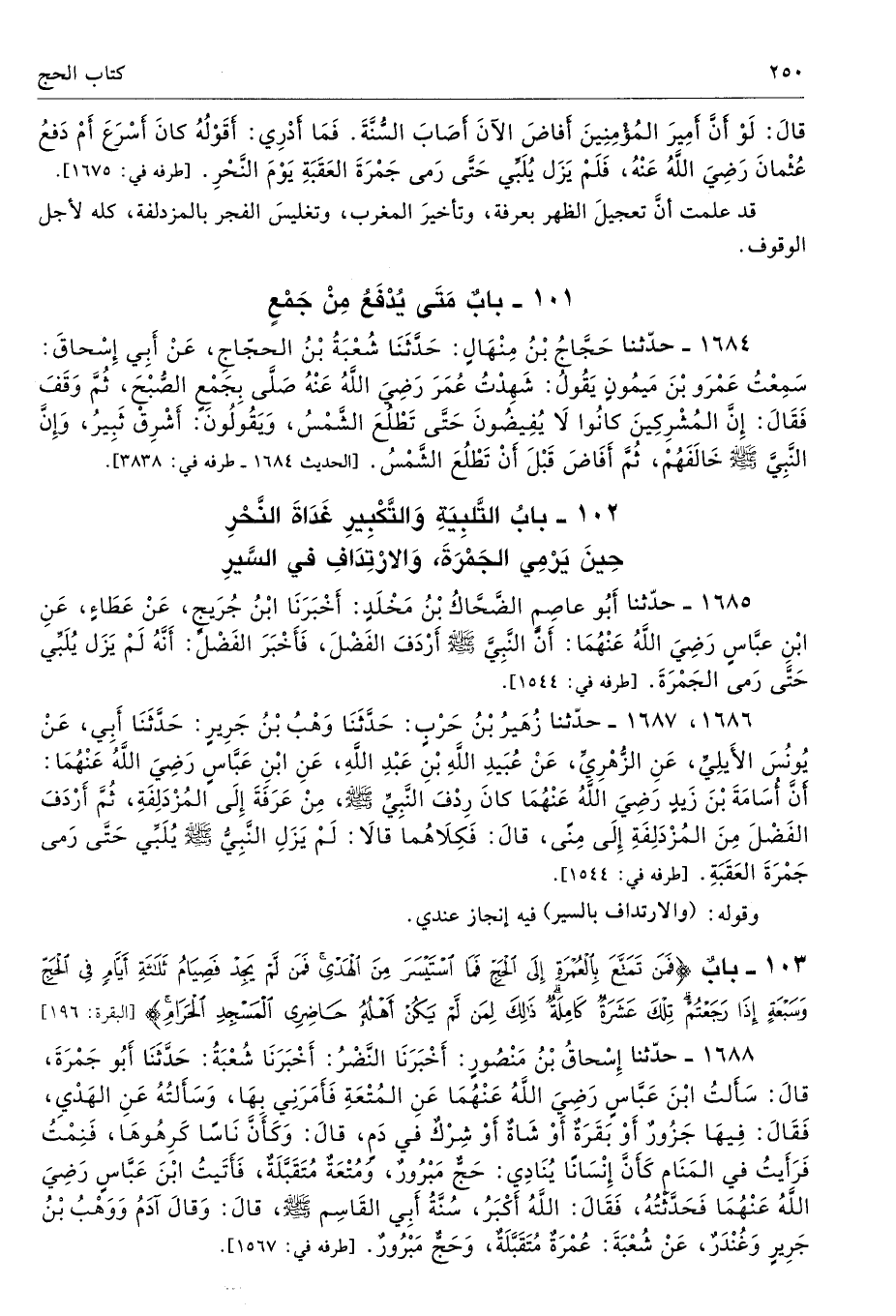 1685 - حَدَّثَنَا أَبُو عَاصِمٍ الضَّحَّاكُ بْنُ مَخْلَدٍ أَخْبَرَنَا ابْنُ جُرَيْجٍ عَنْ عَطَاءٍ عَنِ ابْنِ عَبَّاسٍ - رضى الله عنهما - أَنَّ النَّبِىَّ - صلى الله عليه وسلم - أَرْدَفَ الْفَضْلَ، فَأَخْبَرَ الْفَضْلُ أَنَّهُ لَمْ يَزَلْ يُلَبِّى حَتَّى رَمَى الْجَمْرَةَ. أطرافه 1544، 1670، 1687 - تحفة 5919، 11050