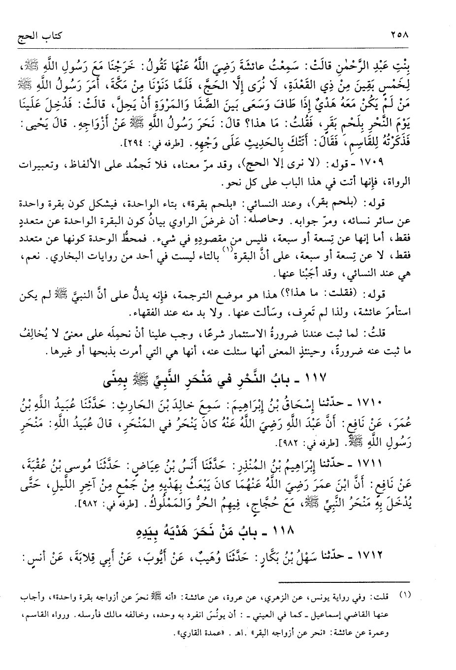 1710 - حَدَّثَنَا إِسْحَاقُ بْنُ إِبْرَاهِيمَ سَمِعَ خَالِدَ بْنَ الْحَارِثِ حَدَّثَنَا عُبَيْدُ اللَّهِ بْنُ عُمَرَ عَنْ نَافِعٍ أَنَّ عَبْدَ اللَّهِ - رضى الله عنه - كَانَ يَنْحَرُ فِى الْمَنْحَرِ. قَالَ عُبَيْدُ اللَّهِ مَنْحَرِ رَسُولِ اللَّهِ - صلى الله عليه وسلم -. أطرافه 982، 1711، 5551، 5552 - تحفة 7882 - 210/ 2