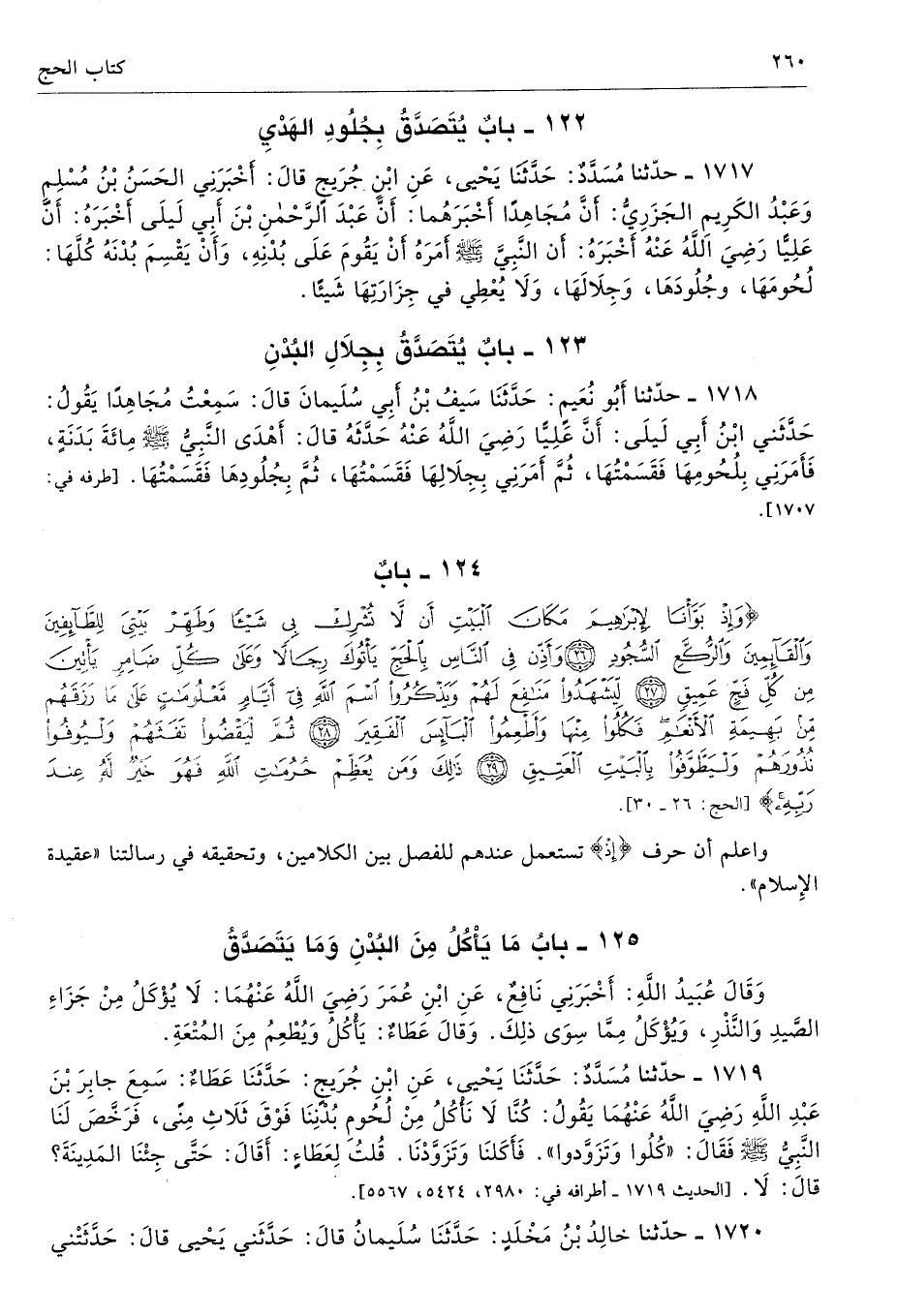 1717 - حَدَّثَنَا مُسَدَّدٌ حَدَّثَنَا يَحْيَى عَنِ ابْنِ جُرَيْجٍ قَالَ أَخْبَرَنِى الْحَسَنُ بْنُ مُسْلِمٍ وَعَبْدُ الْكَرِيمِ الْجَزَرِىُّ أَنَّ مُجَاهِدًا أَخْبَرَهُمَا أَنَّ عَبْدَ الرَّحْمَنِ بْنَ أَبِى لَيْلَى أَخْبَرَهُ أَنَّ عَلِيًّا - رضى الله عنه - أَخْبَرَهُ أَنَّ النَّبِىَّ - صلى الله عليه وسلم - أَمَرَهُ أَنْ يَقُومَ عَلَى بُدْنِهِ، وَأَنْ يَقْسِمَ بُدْنَهُ كُلَّهَا، لُحُومَهَا وَجُلُودَهَا وَجِلاَلَهَا، وَلاَ يُعْطِىَ فِى جِزَارَتِهَا شَيْئًا. أطرافه 1707، 1716، 1716 م، 2299 - تحفة 10219