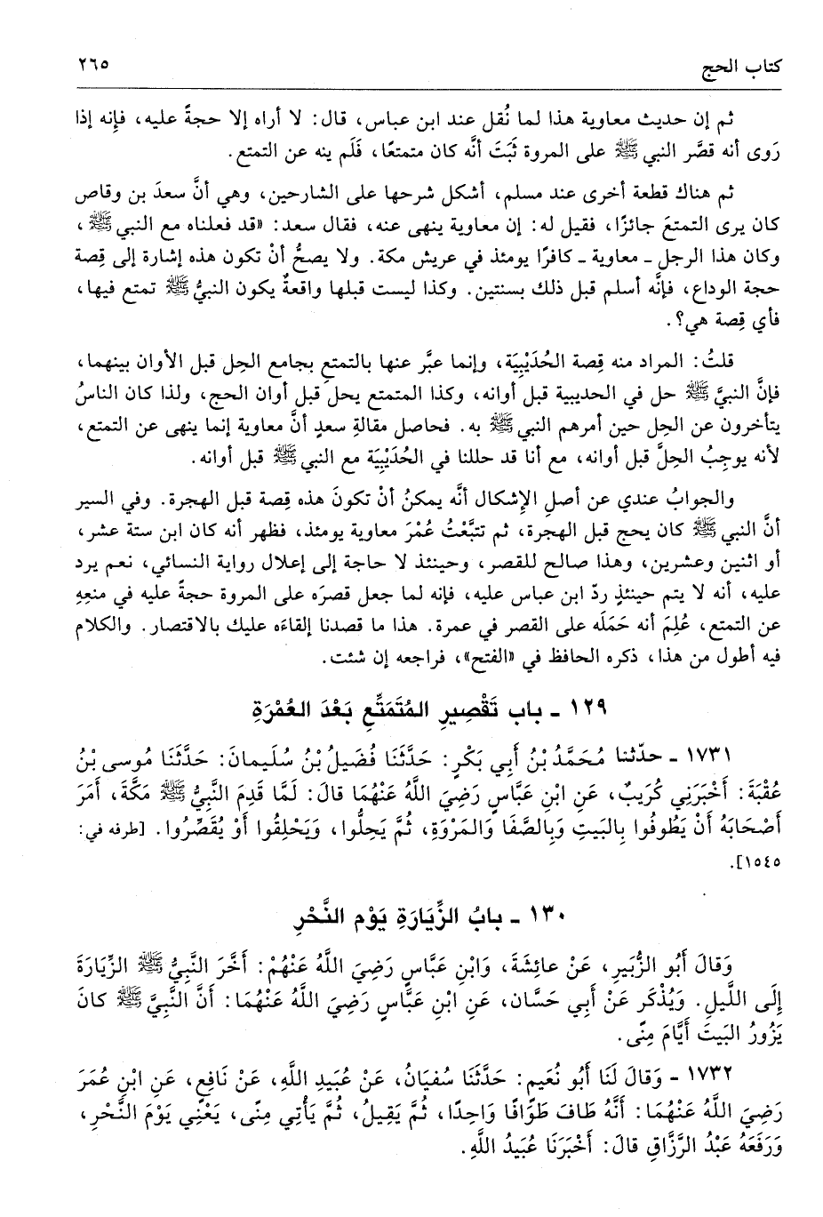 ثم هناك قطعة أخرى عند مسلم، أشكل شرحها على الشارحين، وهي أنَّ سعدَ بن وقاص كان يرى التمتعَ جائزًا، فقيل له: إن معاوية ينهى عنه، فقال سعد: «قد فعلناه مع النبي صلى الله عليه وسلّم وكان هذا الرجل - معاوية - كافرًا يومئذ في عريش مكة. ولا يصحُّ أنْ تكون هذه إشارة إل قِصة حجة الوداع، فإنَّه أسلم قبل ذلك بسنتين. وكذا ليست قبلها واقعةٌ يكون النبيُّ صلى الله عليه وسلّم تمتع فيها، فأي قِصة هي؟.
