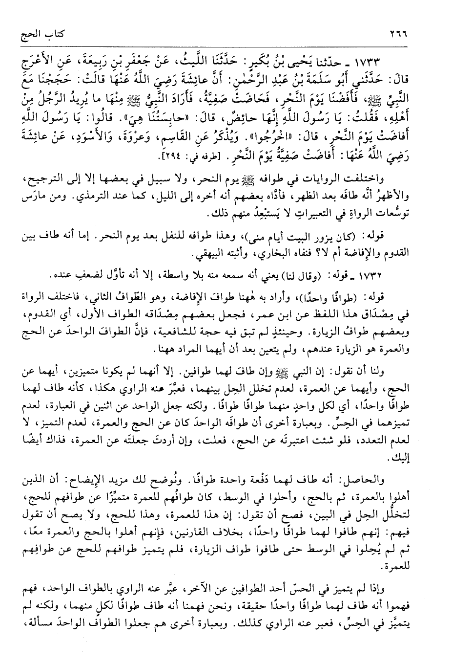 1733 - حَدَّثَنَا يَحْيَى بْنُ بُكَيْرٍ حَدَّثَنَا اللَّيْثُ عَنْ جَعْفَرِ بْنِ رَبِيعَةَ عَنِ الأَعْرَجِ قَالَ حَدَّثَنِى أَبُو سَلَمَةَ بْنُ عَبْدِ الرَّحْمَنِ أَنَّ عَائِشَةَ - رضى الله عنها - قَالَتْ حَجَجْنَا مَعَ النَّبِىِّ - صلى الله عليه وسلم - فَأَفَضْنَا يَوْمَ النَّحْرِ، فَحَاضَتْ صَفِيَّةُ، فَأَرَادَ النَّبِىُّ - صلى الله عليه وسلم - مِنْهَا مَا يُرِيدُ الرَّجُلُ مِنْ أَهْلِهِ. فَقُلْتُ يَا رَسُولَ اللَّهِ إِنَّهَا حَائِضٌ. قَالَ «حَابِسَتُنَا هِىَ». قَالُوا يَا رَسُولَ اللَّهِ، أَفَاضَتْ يَوْمَ النَّحْرِ. قَالَ «اخْرُجُوا». وَيُذْكَرُ عَنِ الْقَاسِمِ وَعُرْوَةَ وَالأَسْوَدِ عَنْ عَائِشَةَ - رضى الله عنها - أَفَاضَتْ صَفِيَّةُ يَوْمَ النَّحْرِ. أطرافه 294، 305، 316، 317، 319، 328، 1516، 1518، 1556، 1560، 1561، 1562، 1638، 1650، 1709، 1720، 1757، 1762، 1771، 1772، 1783، 1786، 1787، 1788، 2952، 2984، 4395، 4401، 4408، 5329، 5548، 5559، 6157، 7229 - تحفة 17733، 17521، 15927 ل، 15946 ل، 15984 ل