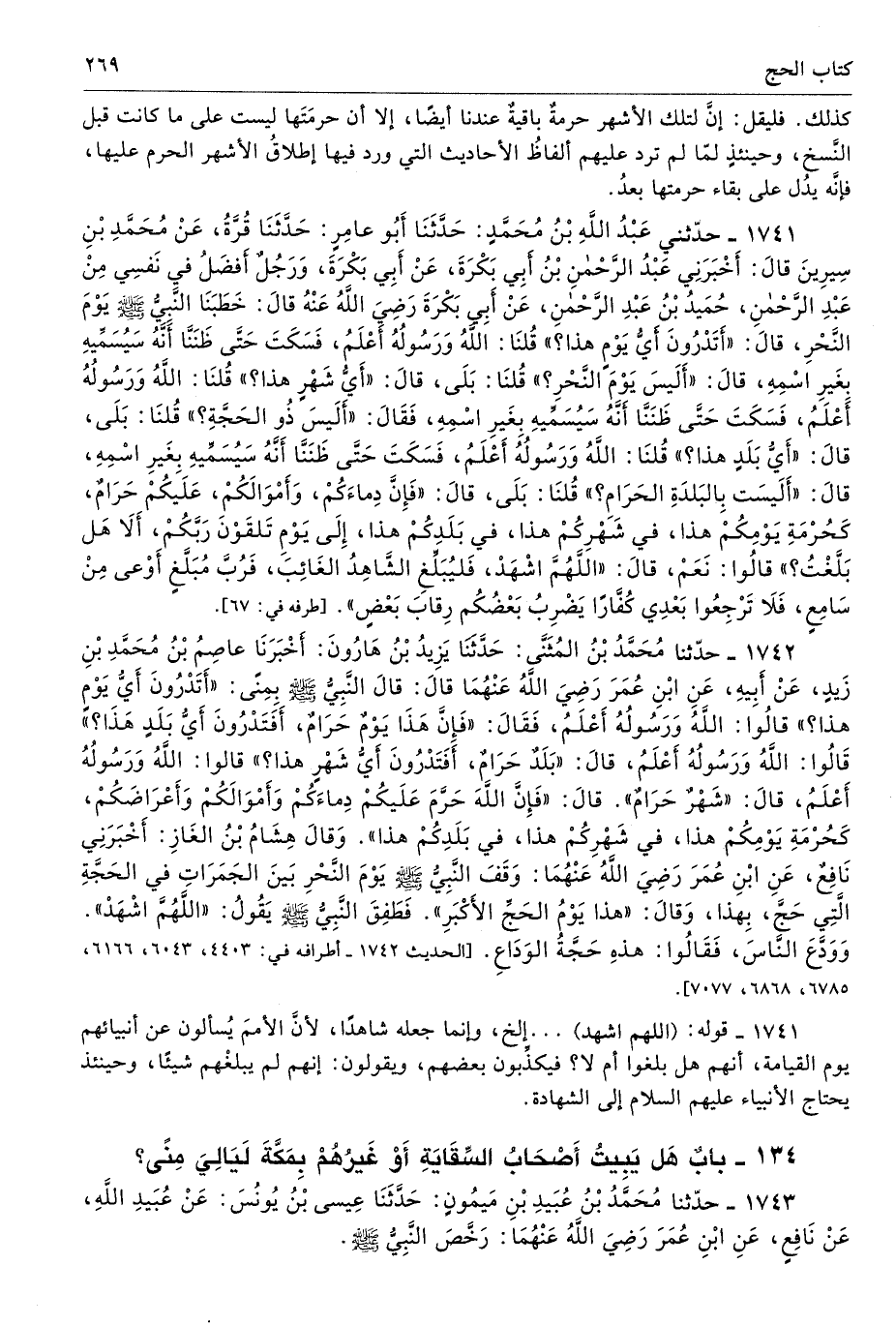1741 - حَدَّثَنِى عَبْدُ اللَّهِ بْنُ مُحَمَّدٍ حَدَّثَنَا أَبُو عَامِرٍ حَدَّثَنَا قُرَّةُ عَنْ مُحَمَّدِ بْنِ سِيرِينَ قَالَ أَخْبَرَنِى عَبْدُ الرَّحْمَنِ بْنُ أَبِى بَكْرَةَ عَنْ أَبِى بَكْرَةَ، وَرَجُلٌ أَفْضَلُ فِى نَفْسِى مِنْ عَبْدِ الرَّحْمَنِ حُمَيْدُ بْنُ عَبْدِ الرَّحْمَنِ عَنْ أَبِى بَكْرَةَ - رضى الله عنه - قَالَ خَطَبَنَا النَّبِىُّ - صلى الله عليه وسلم - يَوْمَ النَّحْرِ، قَالَ «أَتَدْرُونَ أَىُّ يَوْمٍ هَذَا». قُلْنَا اللَّهُ وَرَسُولُهُ أَعْلَمُ. فَسَكَتَ حَتَّى ظَنَنَّا أَنَّهُ سَيُسَمِّيهِ بِغَيْرِ اسْمِهِ. قَالَ «أَلَيْسَ يَوْمَ النَّحْرِ». قُلْنَا بَلَى. قَالَ «أَىُّ شَهْرٍ هَذَا». قُلْنَا اللَّهُ وَرَسُولُهُ أَعْلَمُ. فَسَكَتَ حَتَّى ظَنَنَّا أَنَّهُ سَيُسَمِّيهِ بِغَيْرِ اسْمِهِ. فَقَالَ «أَلَيْسَ ذُو الْحَجَّةِ». قُلْنَا بَلَى. قَالَ «أَىُّ بَلَدٍ هَذَا». قُلْنَا اللَّهُ وَرَسُولُهُ أَعْلَمُ. فَسَكَتَ حَتَّى ظَنَنَّا أَنَّهُ سَيُسَمِّيهِ بِغَيْرِ اسْمِهِ. قَالَ «أَلَيْسَتْ بِالْبَلْدَةِ الْحَرَامِ». قُلْنَا بَلَى. قَالَ «فَإِنَّ دِمَاءَكُمْ وَأَمْوَالَكُمْ عَلَيْكُمْ حَرَامٌ، كَحُرْمَةِ يَوْمِكُمْ هَذَا، فِى شَهْرِكُمْ هَذَا، فِى بَلَدِكُمْ هَذَا، إِلَى يَوْمِ تَلْقَوْنَ رَبَّكُمْ. أَلاَ هَلْ بَلَّغْتُ». قَالُوا نَعَمْ. قَالَ «اللَّهُمَّ اشْهَدْ، فَلْيُبَلِّغِ الشَّاهِدُ الْغَائِبَ، فَرُبَّ مُبَلَّغٍ أَوْعَى مِنْ سَامِعٍ، فَلاَ تَرْجِعُوا بَعْدِى كُفَّارًا يَضْرِبُ بَعْضُكُمْ رِقَابَ بَعْضٍ». أطرافه 67، 105، 3197، 4406، 4662، 5550، 7078، 7447 تحفة 11682، 11671