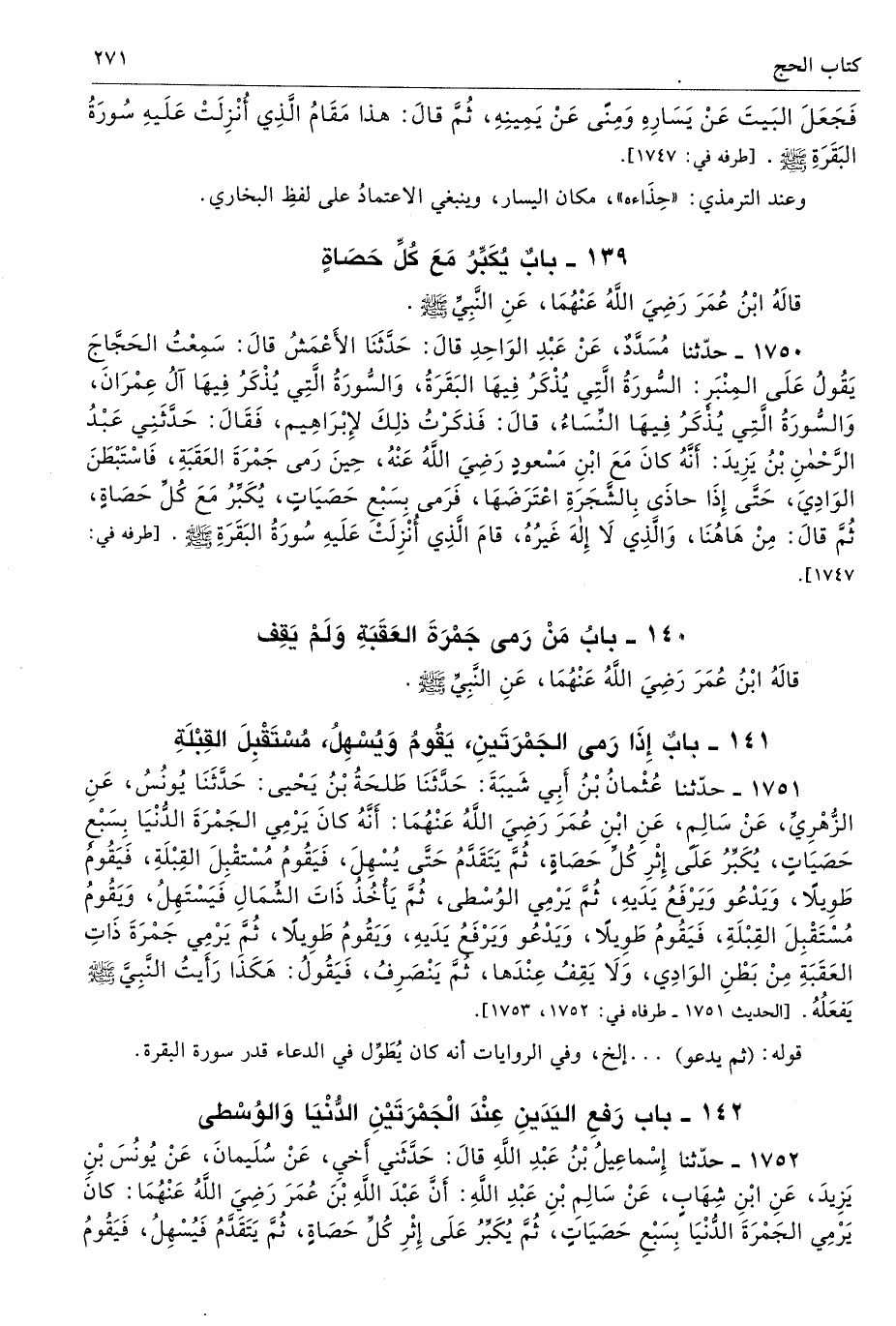 142 - باب رَفْعِ الْيَدَيْنِ عِنْدَ الجَمْرَتَيْنِ الدُّنْيَا وَالْوُسْطَى