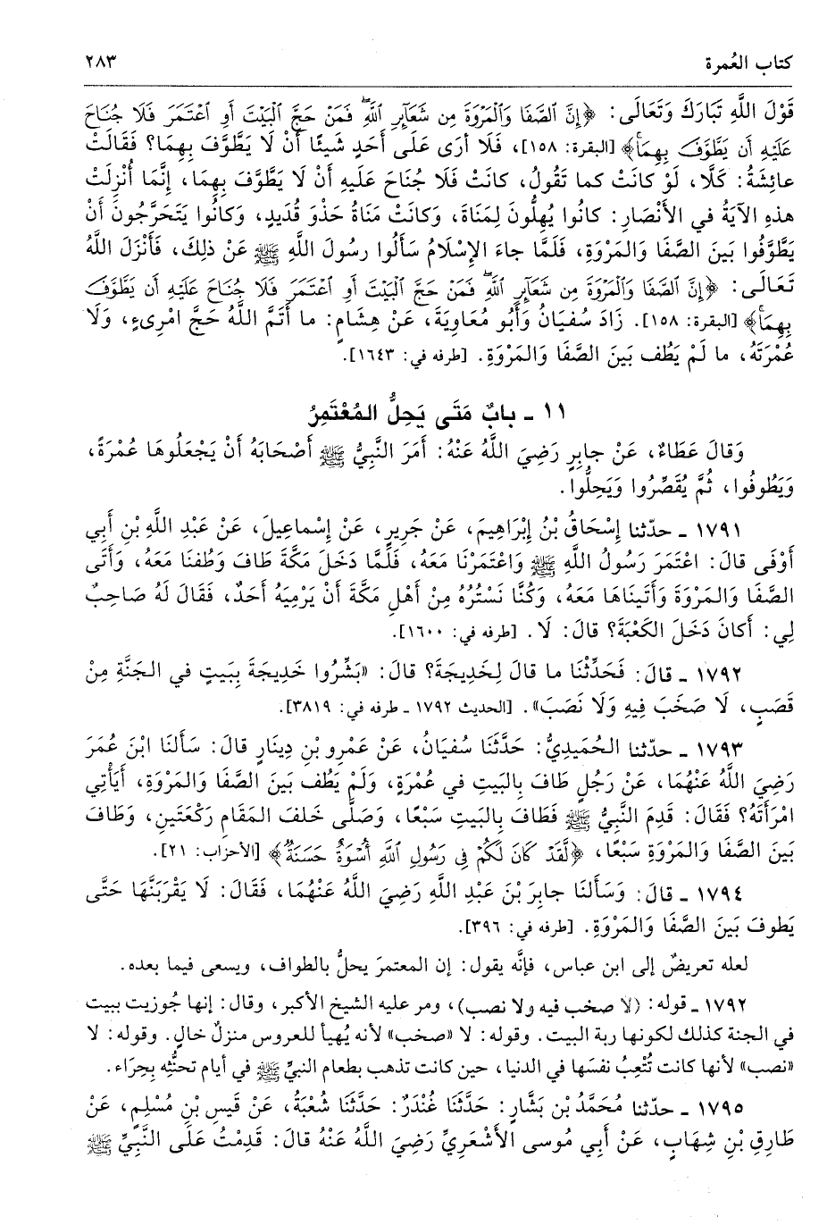 1794 - قَالَ وَسَأَلْنَا جَابِرَ بْنَ عَبْدِ اللَّهِ - رضى الله عنهما - فَقَالَ لاَ يَقْرَبَنَّهَا حَتَّى يَطُوفَ بَيْنَ الصَّفَا وَالْمَرْوَةِ. أطرافه 396، 1624، 1646 - تحفة 2544