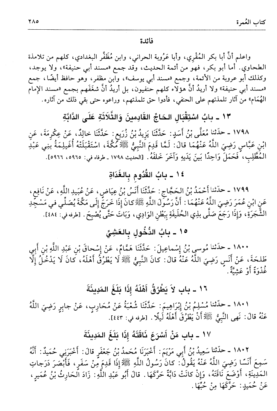 1802 - حَدَّثَنَا سَعِيدُ بْنُ أَبِى مَرْيَمَ أَخْبَرَنَا مُحَمَّدُ بْنُ جَعْفَرٍ قَالَ أَخْبَرَنِى حُمَيْدٌ أَنَّهُ سَمِعَ أَنَسًا - رضى الله عنه - يَقُولُ كَانَ رَسُولُ اللَّهِ - صلى الله عليه وسلم - إِذَا قَدِمَ مِنْ سَفَرٍ، فَأَبْصَرَ دَرَجَاتِ الْمَدِينَةِ أَوْضَعَ نَاقَتَهُ، وَإِنْ كَانَتْ دَابَّةً حَرَّكَهَا. قَالَ أَبُو عَبْدِ اللَّهِ زَادَ الْحَارِثُ بْنُ عُمَيْرٍ عَنْ حُمَيْدٍ حَرَّكَهَا مِنْ حُبِّهَا. طرفه 1886 - تحفة 744، 609