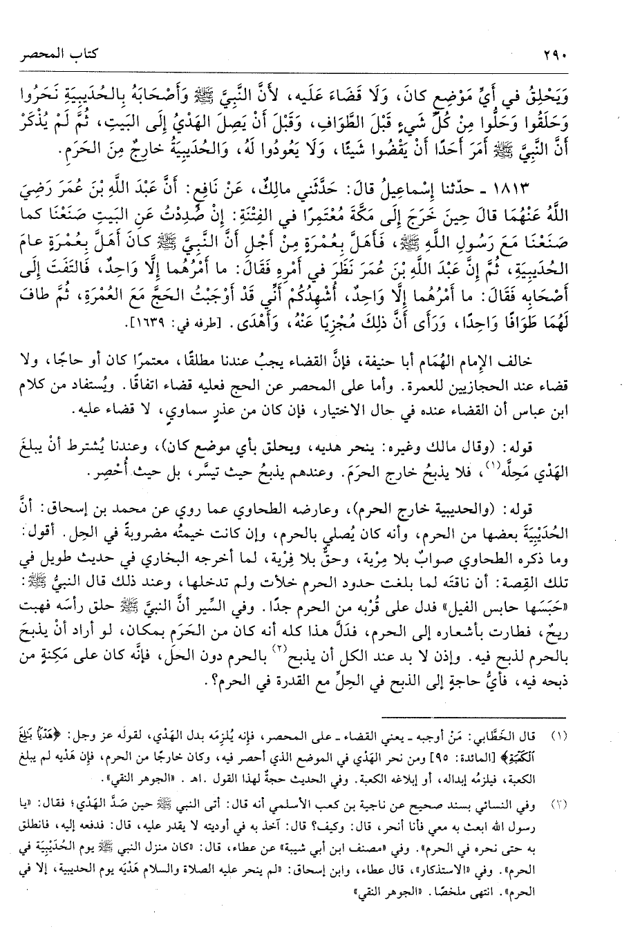 (¬1) قال الخَطَّابي: مَنْ أوجبه -يعني القضاء- على المحصر، فإِنه يُلزِمَه بدل الهَدْي، لقولَه عز وجل: {هَدْيًا بَالِغَ الْكَعْبَةِ} [المائدة: 95] ومن نحر الهَدْي في الموضع الذي أحصر فيه، وكان خارجًا من الحرم، فإِن هَدْيه لم يبلغ الكعبة، فيلزمُه إبداله، أو إبلاغه الكعبة. وفي الحديث حجةٌ لهذا القول. اهـ. "الجوهر النقي".
