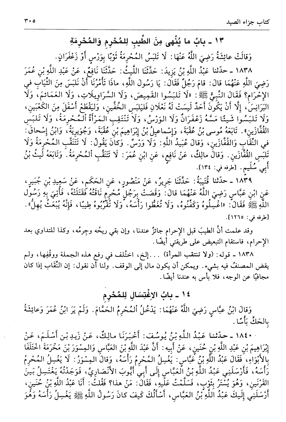 1838 - حَدَّثَنَا عَبْدُ اللَّهِ بْنُ يَزِيدَ حَدَّثَنَا اللَّيْثُ حَدَّثَنَا نَافِعٌ عَنْ عَبْدِ اللَّهِ بْنِ عُمَرَ - رضى الله عنهما - قَالَ قَامَ رَجُلٌ فَقَالَ يَا رَسُولَ اللَّهِ مَاذَا تَأْمُرُنَا أَنْ نَلْبَسَ مِنَ الثِّيَابِ فِى الإِحْرَامِ فَقَالَ النَّبِىُّ - صلى الله عليه وسلم - «لاَ تَلْبَسُوا الْقَمِيصَ وَلاَ السَّرَاوِيلاَتِ وَلاَ الْعَمَائِمَ، وَلاَ الْبَرَانِسَ إِلاَّ أَنْ يَكُونَ أَحَدٌ لَيْسَتْ لَهُ نَعْلاَنِ، فَلْيَلْبَسِ الْخُفَّيْنِ، وَلْيَقْطَعْ أَسْفَلَ مِنَ الْكَعْبَيْنِ، وَلاَ تَلْبَسُوا شَيْئًا مَسَّهُ زَعْفَرَانٌ، وَلاَ الْوَرْسُ، وَلاَ تَنْتَقِبِ الْمَرْأَةُ الْمُحْرِمَةُ وَلاَ تَلْبَسِ الْقُفَّازَيْنِ». تَابَعَهُ مُوسَى بْنُ عُقْبَةَ وَإِسْمَاعِيلُ بْنُ إِبْرَاهِيمَ بْنِ عُقْبَةَ وَجُوَيْرِيَةُ وَابْنُ إِسْحَاقَ فِى النِّقَابِ وَالْقُفَّازَيْنِ. وَقَالَ عُبَيْدُ اللَّهِ وَلاَ وَرْسٌ وَكَانَ يَقُولُ لاَ تَتَنَقَّبِ الْمُحْرِمَةُ، وَلاَ تَلْبَسِ الْقُفَّازَيْنِ. وَقَالَ مَالِكٌ عَنْ نَافِعٍ عَنِ ابْنِ عُمَرَ لاَ تَتَنَقَّبِ الْمُحْرِمَةُ. وَتَابَعَهُ لَيْثُ بْنُ أَبِى سُلَيْمٍ. أطرافه 134، 366، 1542، 1842، 5794، 5803، 5805، 5806، 5847، 5852 - تحفة 8275، 8470، 7495، 7642، 8405، 8392 أ، 8317 - 20/ 3