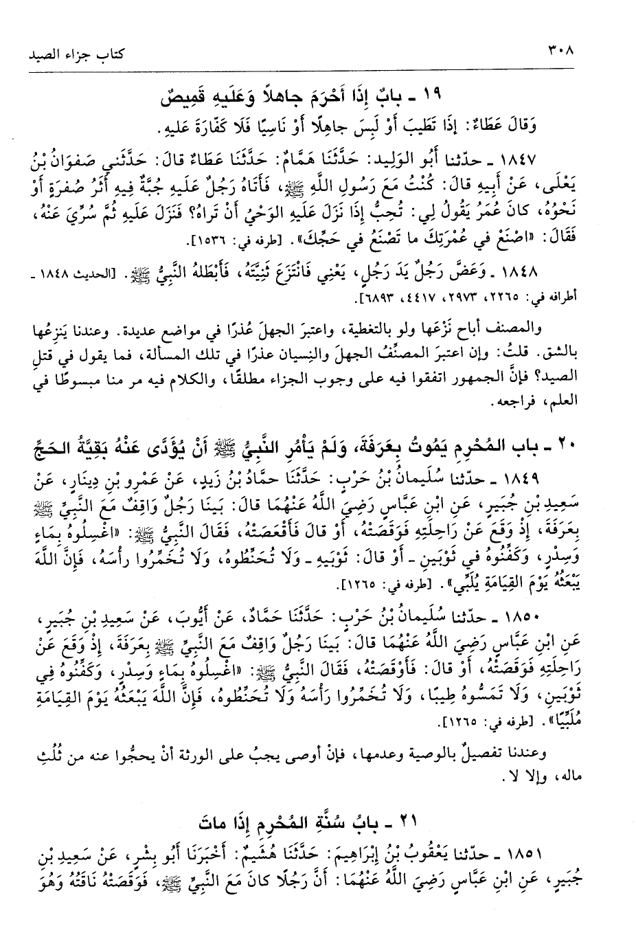 1849 - حَدَّثَنَا سُلَيْمَانُ بْنُ حَرْبٍ حَدَّثَنَا حَمَّادُ بْنُ زَيْدٍ عَنْ عَمْرِو بْنِ دِينَارٍ عَنْ سَعِيدِ بْنِ جُبَيْرٍ عَنِ ابْنِ عَبَّاسٍ - رضى الله عنهما - قَالَ بَيْنَا رَجُلٌ وَاقِفٌ مَعَ النَّبِىِّ - صلى الله عليه وسلم - بِعَرَفَةَ إِذْ وَقَعَ عَنْ رَاحِلَتِهِ، فَوَقَصَتْهُ - أَوْ قَالَ فَأَقْعَصَتْهُ - فَقَالَ النَّبِىُّ - صلى الله عليه وسلم - «اغْسِلُوهُ بِمَاءٍ وَسِدْرٍ، وَكَفِّنُوهُ فِى ثَوْبَيْنِ - أَوْ قَالَ ثَوْبَيْهِ - وَلاَ تُحَنِّطُوهُ، وَلاَ تُخَمِّرُوا رَأْسَهُ، فَإِنَّ اللَّهَ يَبْعَثُهُ يَوْمَ الْقِيَامَةِ يُلَبِّى». أطرافه 1265، 1266، 1267، 1268، 1839، 1850، 1851 - تحفة 5582