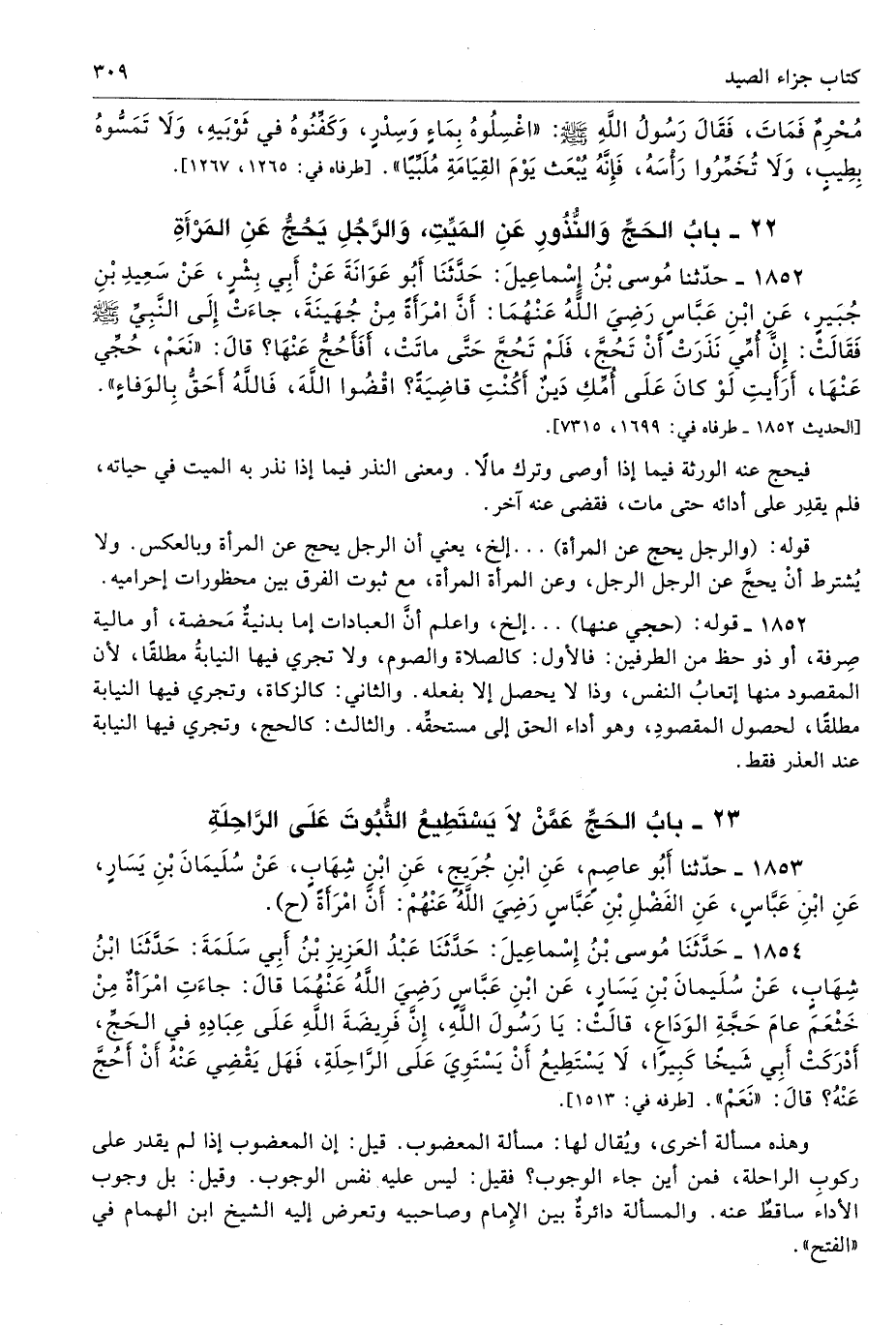 1854 - حَدَّثَنَا مُوسَى بْنُ إِسْمَاعِيلَ حَدَّثَنَا عَبْدُ الْعَزِيزِ بْنُ أَبِى سَلَمَةَ حَدَّثَنَا ابْنُ شِهَابٍ عَنْ سُلَيْمَانَ بْنِ يَسَارٍ عَنِ ابْنِ عَبَّاسٍ - رضى الله عنهما - قَالَ جَاءَتِ امْرَأَةٌ مِنْ خَثْعَمَ، عَامَ حَجَّةِ الْوَدَاعِ، قَالَتْ يَا رَسُولَ اللَّهِ إِنَّ فَرِيضَةَ اللَّهِ عَلَى عِبَادِهِ فِى الْحَجِّ أَدْرَكَتْ أَبِى شَيْخًا كَبِيرًا، لاَ يَسْتَطِيعُ أَنْ يَسْتَوِىَ عَلَى الرَّاحِلَةِ فَهَلْ يَقْضِى عَنْهُ أَنْ أَحُجَّ عَنْهُ قَالَ «نَعَمْ». أطرافه 1513، 1855، 4399، 6228 - تحفة 5670