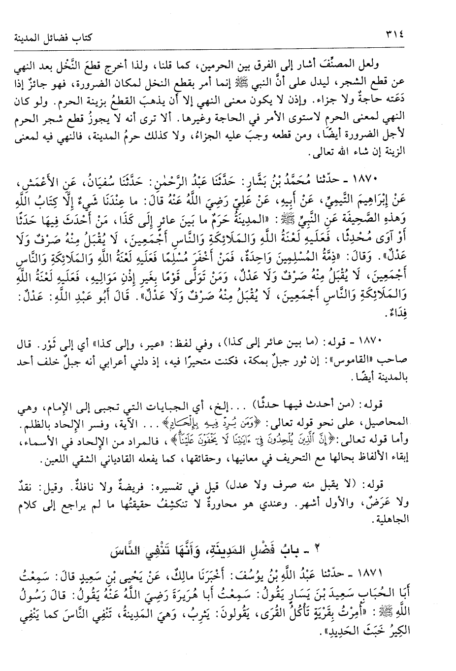1870 - حَدَّثَنَا مُحَمَّدُ بْنُ بَشَّارٍ حَدَّثَنَا عَبْدُ الرَّحْمَنِ حَدَّثَنَا سُفْيَانُ عَنِ الأَعْمَشِ عَنْ إِبْرَاهِيمَ التَّيْمِىِّ عَنْ أَبِيهِ عَنْ عَلِىٍّ - رضى الله عنه - قَالَ مَا عِنْدَنَا شَىْءٌ إِلاَّ كِتَابُ اللَّهِ، وَهَذِهِ الصَّحِيفَةُ عَنِ النَّبِىِّ - صلى الله عليه وسلم - «الْمَدِينَةُ حَرَمٌ، مَا بَيْنَ عَائِرٍ إِلَى كَذَا، مَنْ أَحْدَثَ فِيهَا حَدَثًا، أَوْ آوَى مُحْدِثًا، فَعَلَيْهِ لَعْنَةُ اللَّهِ وَالْمَلاَئِكَةِ وَالنَّاسِ أَجْمَعِينَ، لاَ يُقْبَلُ مِنْهُ صَرْفٌ وَلاَ عَدْلٌ». وَقَالَ «ذِمَّةُ الْمُسْلِمِينَ وَاحِدَةٌ، فَمَنْ أَخْفَرَ مُسْلِمًا فَعَلَيْهِ لَعْنَةُ اللَّهِ وَالْمَلاَئِكَةِ وَالنَّاسِ أَجْمَعِينَ، لاَ يُقْبَلُ مِنْهُ صَرْفٌ وَلاَ عَدْلٌ، وَمَنْ تَوَلَّى قَوْمًا بِغَيْرِ إِذْنِ مَوَالِيهِ، فَعَلَيْهِ لَعْنَةُ اللَّهِ وَالْمَلاَئِكَةِ وَالنَّاسِ أَجْمَعِينَ، لاَ يُقْبَلُ مِنْهُ صَرْفٌ وَلاَ عَدْلٌ». أطرافه 111، 3047، 3172، 3179، 6755، 6903، 6915، 7300 تحفة 10317
