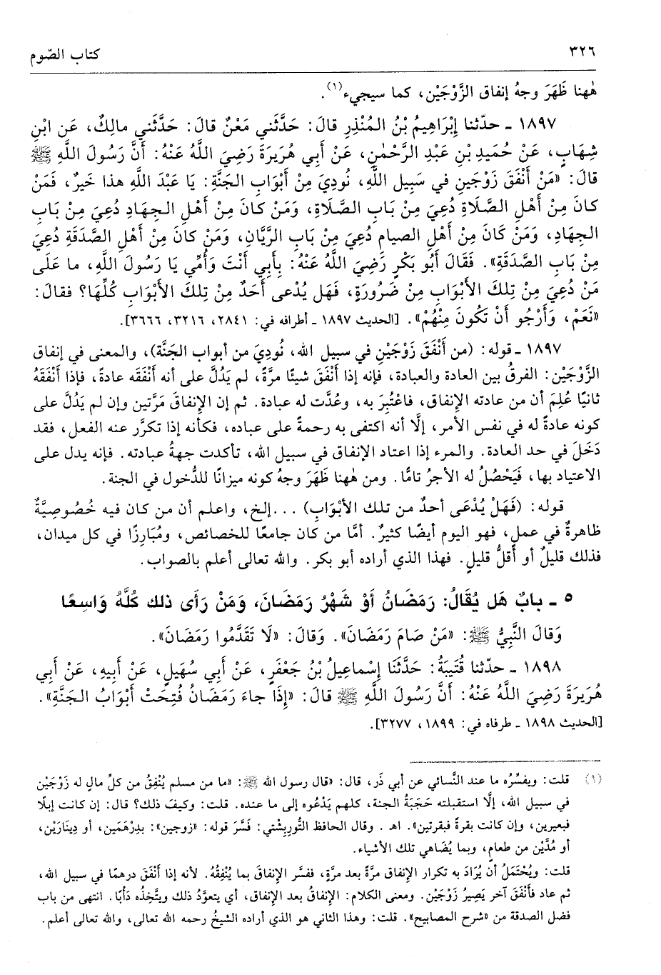 1897 - حَدَّثَنَا إِبْرَاهِيمُ بْنُ الْمُنْذِرِ قَالَ حَدَّثَنِى مَعْنٌ قَالَ حَدَّثَنِى مَالِكٌ عَنِ ابْنِ شِهَابٍ عَنْ حُمَيْدِ بْنِ عَبْدِ الرَّحْمَنِ عَنْ أَبِى هُرَيْرَةَ - رضى الله عنه - أَنَّ رَسُولَ اللَّهِ - صلى الله عليه وسلم - قَالَ «مَنْ أَنْفَقَ زَوْجَيْنِ فِى سَبِيلِ اللَّهِ نُودِىَ مِنْ أَبْوَابِ الْجَنَّةِ يَا عَبْدَ اللَّهِ، هَذَا خَيْرٌ. فَمَنْ كَانَ مِنْ أَهْلِ الصَّلاَةِ دُعِىَ مِنْ بَابِ الصَّلاَةِ، وَمَنْ كَانَ مِنْ أَهْلِ الْجِهَادِ دُعِىَ مِنْ بَابِ الْجِهَادِ، وَمَنْ كَانَ مِنْ أَهْلِ الصِّيَامِ دُعِىَ مِنْ بَابِ الرَّيَّانِ، وَمَنْ كَانَ مِنْ أَهْلِ الصَّدَقَةِ دُعِىَ مِنْ بَابِ الصَّدَقَةِ». فَقَالَ أَبُو بَكْرٍ - رضى الله عنه - بِأَبِى أَنْتَ وَأُمِّى يَا رَسُولَ اللَّهِ، مَا عَلَى مَنْ دُعِىَ مِنْ تِلْكَ الأَبْوَابِ مِنْ ضَرُورَةٍ، فَهَلْ يُدْعَى أَحَدٌ مِنْ تِلْكَ الأَبْوَابِ كُلِّهَا قَالَ «نَعَمْ. وَأَرْجُو أَنْ تَكُونَ مِنْهُمْ». أطرافه 2841، 3216، 3666 - تحفة 12279