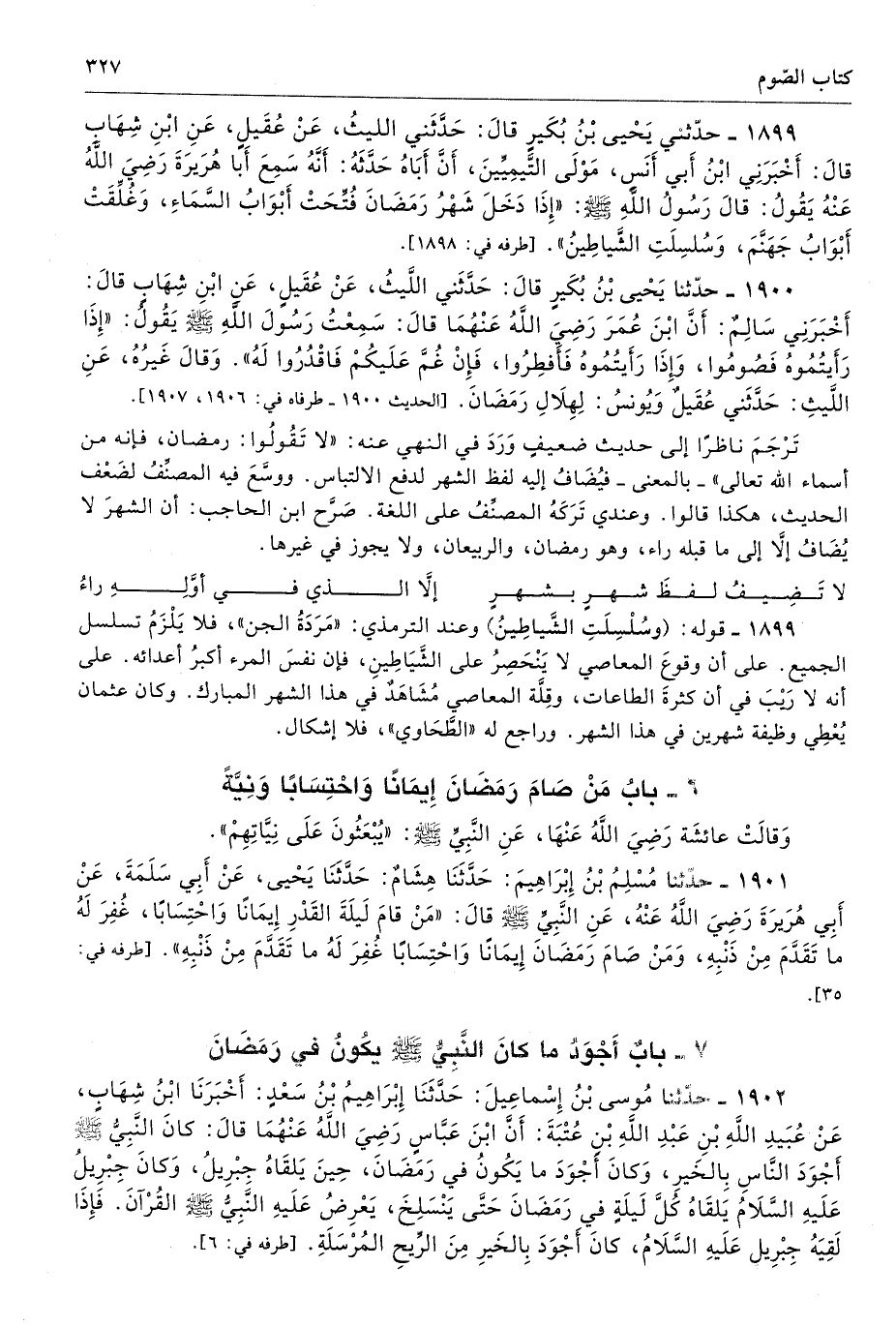 1902 - حَدَّثَنَا مُوسَى بْنُ إِسْمَاعِيلَ حَدَّثَنَا إِبْرَاهِيمُ بْنُ سَعْدٍ أَخْبَرَنَا ابْنُ شِهَابٍ عَنْ عُبَيْدِ اللَّهِ بْنِ عَبْدِ اللَّهِ بْنِ عُتْبَةَ أَنَّ ابْنَ عَبَّاسٍ - رضى الله عنهما - قَالَ كَانَ النَّبِىُّ - صلى الله عليه وسلم - أَجْوَدَ النَّاسِ بِالْخَيْرِ، وَكَانَ أَجْوَدُ مَا يَكُونُ فِى رَمَضَانَ، حِينَ يَلْقَاهُ جِبْرِيلُ، وَكَانَ جِبْرِيلُ - عَلَيْهِ السَّلاَمُ - يَلْقَاهُ كُلَّ لَيْلَةٍ فِى رَمَضَانَ حَتَّى يَنْسَلِخَ، يَعْرِضُ عَلَيْهِ النَّبِىُّ - صلى الله عليه وسلم - الْقُرْآنَ، فَإِذَا لَقِيَهُ جِبْرِيلُ - عَلَيْهِ السَّلاَمُ - كَانَ أَجْوَدَ بِالْخَيْرِ مِنَ الرِّيحِ الْمُرْسَلَةِ. أطرافه 6، 3220، 3554، 4997 - تحفة 5840
