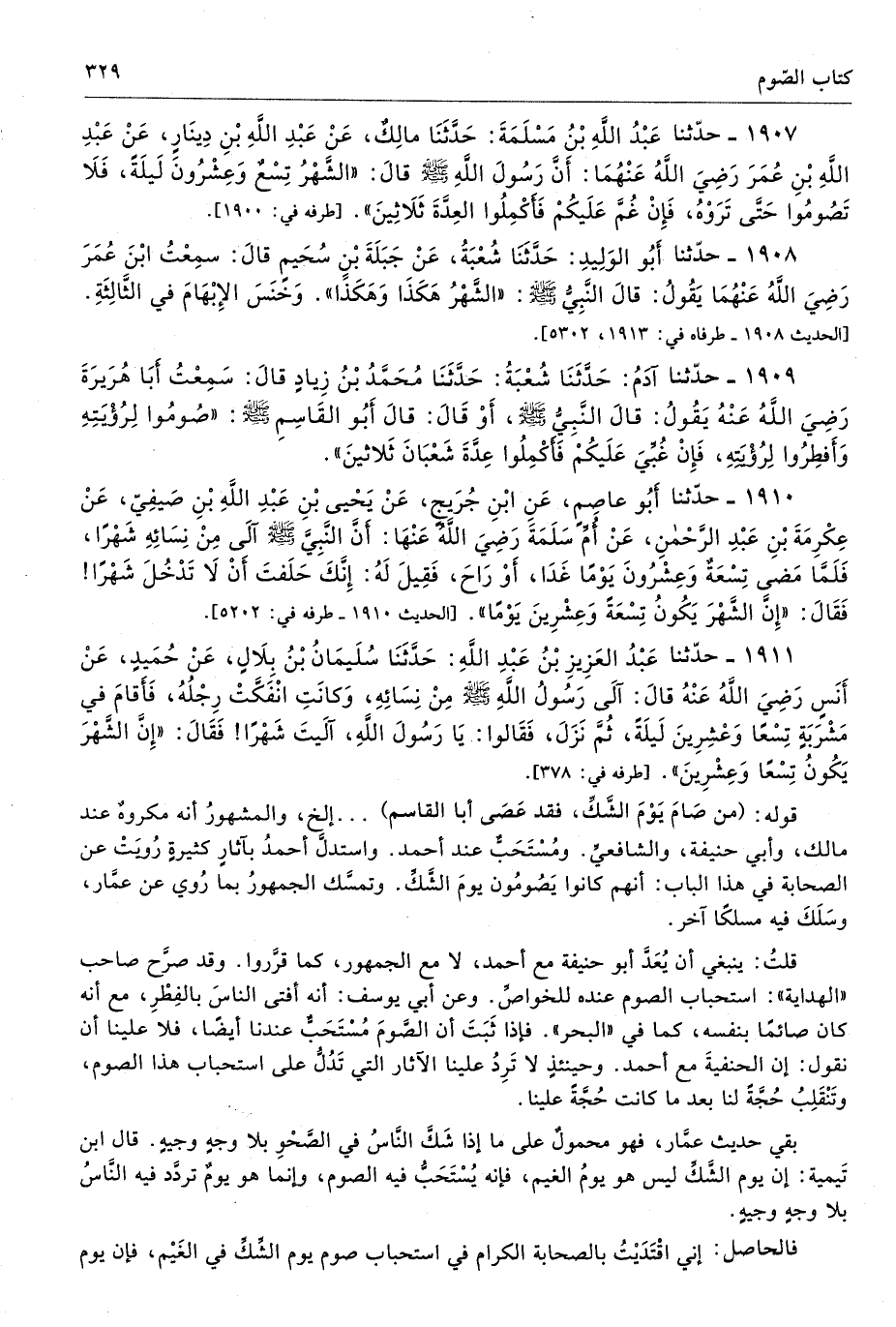 1907 - حَدَّثَنَا عَبْدُ اللَّهِ بْنُ مَسْلَمَةَ حَدَّثَنَا مَالِكٌ عَنْ عَبْدِ اللَّهِ بْنِ دِينَارٍ عَنْ عَبْدِ اللَّهِ بْنِ عُمَرَ - رضى الله عنهما - أَنَّ رَسُولَ اللَّهِ - صلى الله عليه وسلم - قَالَ «الشَّهْرُ تِسْعٌ وَعِشْرُونَ لَيْلَةً، فَلاَ تَصُومُوا حَتَّى تَرَوْهُ، فَإِنْ غُمَّ عَلَيْكُمْ فَأَكْمِلُوا الْعِدَّةَ ثَلاَثِينَ». طرفاه 1900، 1906 - تحفة 7241
