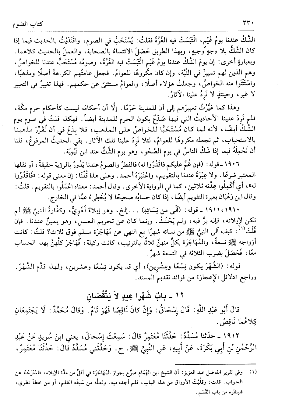 وهذا كما غيَّرْتُ تعبيرَهم إلى أن للمدينة حَرَمًا. إلا أن أحكامَه ليست كأحكام حرم مكَّة، فلم تَرِدْ علينا الأحاديثُ التي فيها صَدْعٌ بكون الحرم للمدينة أيضًا. فهكذا قلتُ في صوم يوم الشَّكِّ أيضًا، لأنه لما كان مُسْتَحَبَّا للخواصِّ على المذهب، فلا بِدْعَ في أن نُقَرِّرَ مذهبنا بالاستحباب، ثم نجعله مكروهًا للعوامِّ، لئلا تَرِدَ علينا تلك الآثار. بقي الحديثُ المرفوعُ، فلنا أن نَحْمِلَهُ فيما إذا شَكَّ الناسُ في يوم الصَّحْو، وهو يوم الشَّكِّ عند ابن تَيْمِيَة.