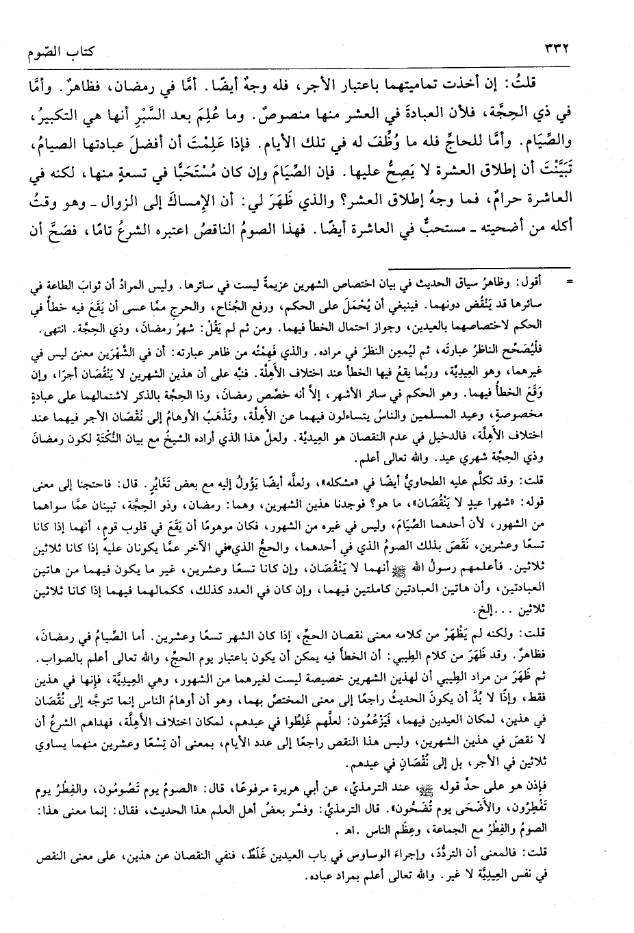قلتُ: إن أخذت تماميتهما باعتبار الأجر، فله وجهٌ أيضًا. أمَّا في رمضان، فظاهرٌ. وأمَّا في ذي الحِجَّة، فلأن العبادةَ في العشر منها منصوصٌ. وما عُلِمَ بعد السَّبْرِ أنها هي التكبيرُ، والصِّيَام. وأمَّا للحاجِّ فله ما وُظِّفَ له في تلك الأيام. فإذا عَلِمْتَ أن أفضلَ عبادتها الصيامُ، تَبَيَّنْتَ أن إطلاق العشرة لا يَصِحُّ عليها. فإن الصِّيَامَ وإن كان مُسْتَحَبَّا في تسعةٍ منها، لكنه في العاشرة حرامٌ، فما وجهُ إطلاق العشر؟ والذي ظَهَرَ لي: أن الإِمساكَ إلى الزوال - وهو وقتُ أكله من أضحيته - مستحبٌّ في العاشرة أيضًا. فهذا الصومُ الناقصُ اعتبره الشرعُ تامًا، فصَحَّ أن