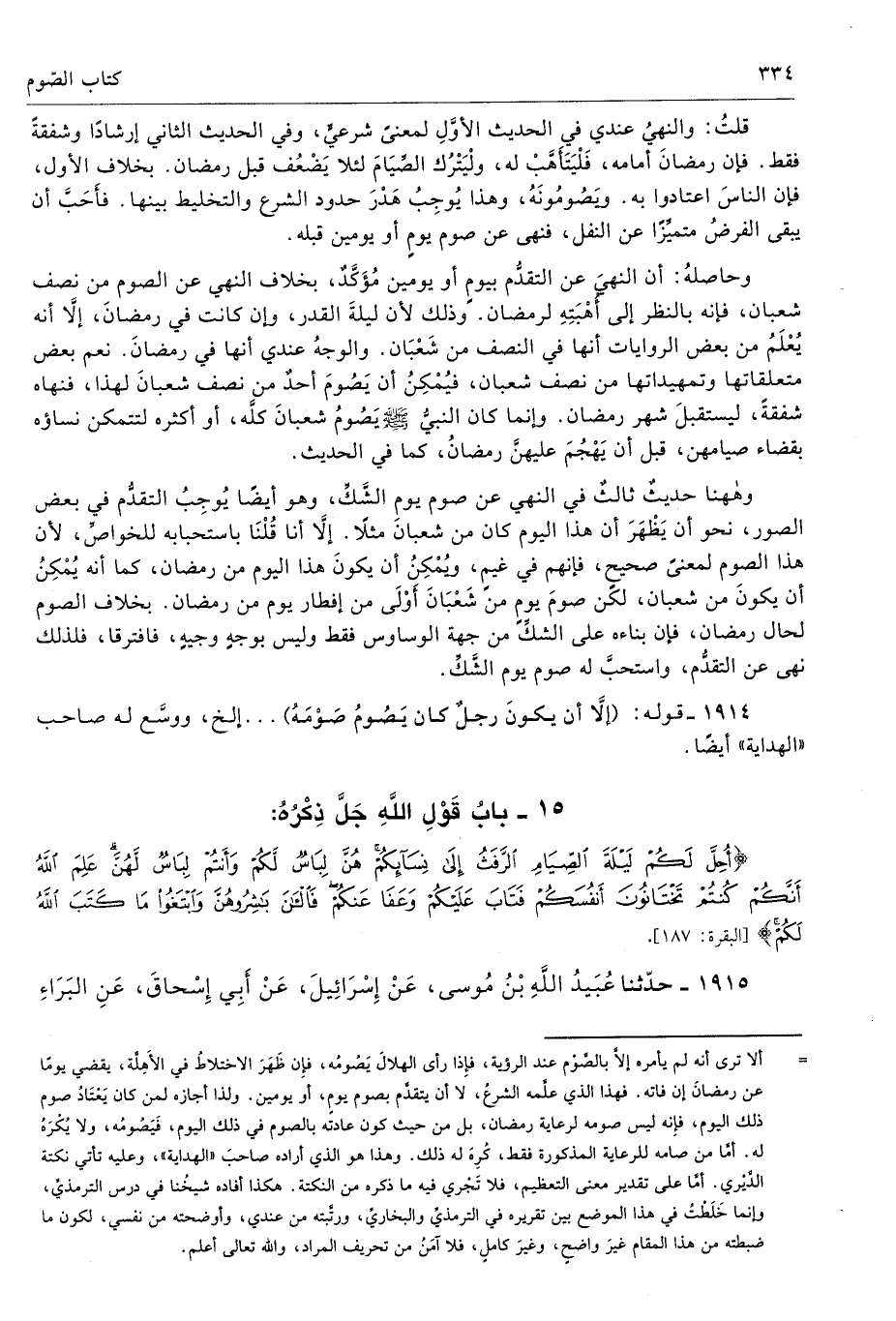 وحاصلهُ: أن النهيَ عن التقدُّم بيومٍ أو يومين مُؤَكَّدٌ، بخلاف النهي عن الصوم من نصف شعبان، فإنه بالنظر إلى أُهْبَتِهِ لرمضان. وذلك لأن ليلةَ القدر، وإن كانت في رمضانَ، إلا أنه يُعْلَمُ من بعض الروايات أنها في النصف من شَعْبَان. والوجهُ عندي أنها في رمضانَ. نعم بعض متعلقاتها وتمهيداتها من نصف شعبان، فيُمْكِنُ أن يَصُومَ أحدٌ من نصف شعبانَ لهذا، فنهاه شفقةً، ليستقبلَ شهر رمضان. وإنما كان النبيُّ صلى الله عليه وسلّم يَصُومُ شعبانَ كلَّه، أو أكثره لتتمكن نساؤه بقضاء صيامهن، قبل أن يَهْجُمَ عليهنَّ رمضانُ، كما في الحديث.